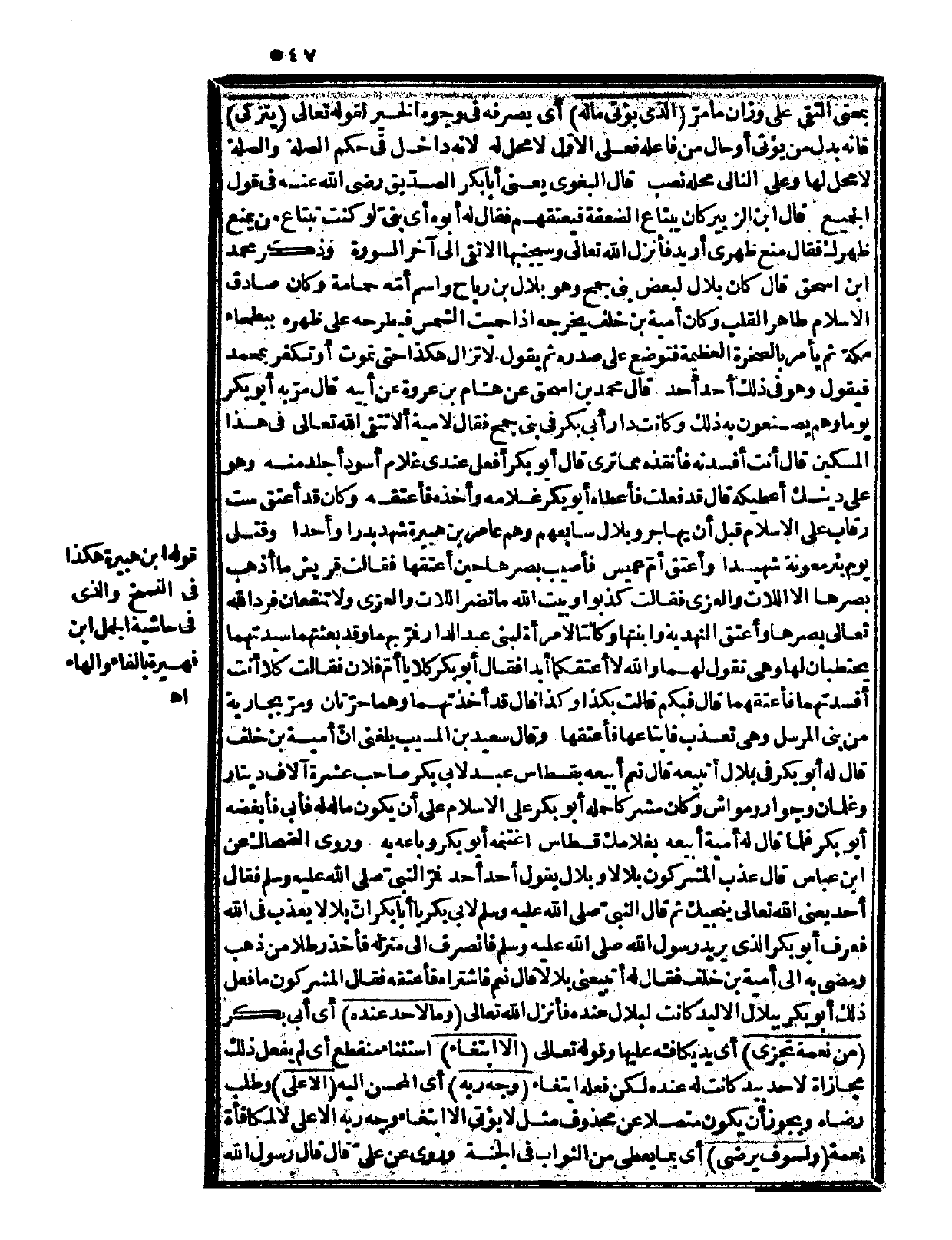 وقال سعيد بن المسيب: بلغني أنّ أمية بن خلف قال له أبو بكر في بلال: أتبيعه؟ قال: نعم أبيعه بقسطاس عبدٍ لأبي بكر صاحب عشرة آلاف دينار وغلمان وجوارٍ ومواشٍ وكان مشركاً، حمله أبو بكر على الإسلام على أن يكون ماله له فأبى، فأبغضه أبو بكر فلما قال له أمية: أبيعه بغلامك قسطاس اغتنمه أبو بكر وباعه به. وروى الضحاك عن ابن عباس قال: عذب المشركون بلالاً وبلال يقول أحد أحد، فمرّ النبيّ صلى الله عليه وسلم فقال: «أحد يعني الله تعالى ينجيك، ثم قال النبيّ صلى الله عليه وسلم لأبي بكر: يا أبا بكر إنّ بلالاً يعذب في الله فعرف أبو بكر الذي يريد رسول الله صلى الله عليه وسلم فانصرف إلى منزله فأخذ رطلاً من ذهب ومضى به إلى أمية بن خلف، فقال له: أتبيعني بلالاً قال: نعم فاشتراه فأعتقه، فقال: المشركون ما فعل ذلك أبو بكر ببلال إلا ليد كانت لبلال عنده» فأنزل الله تعالى: