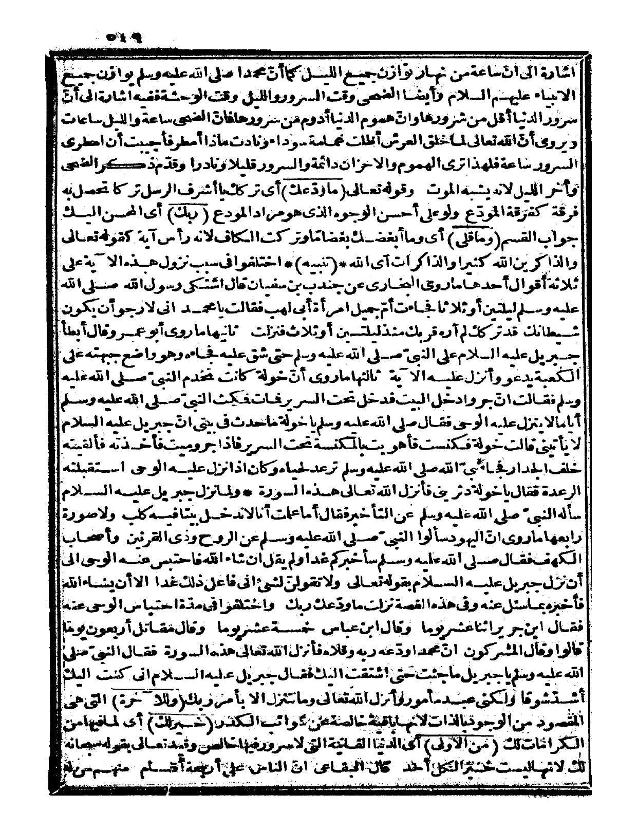 فأخبره بما سئل عنه، وفي هذه القصة نزلت {ما ودّعك ربك} » واختلفوا في مدّة احتباس الوحي عنه. فقال ابن جرير: اثنا عشر يوماً. وقال ابن عباس: خمسة عشر يوماً. وقال مقاتل: أربعون يوماً. قالوا: وقال المشركون: إنّ محمداً ودّعه ربه وقلاه فأنزل الله تعالى هذه السورة فقال النبيّ صلى الله عليه وسلم «يا جبريل ما جئت حتى اشتقت إليك؟ فقال جبريل عليه السلام: إني كنت إليك أشدّ شوقاً ولكني عبد مأمور وأنزل الله تعالى: {وما نتنزل إلا بأمر ربك} » (مريم: 64)