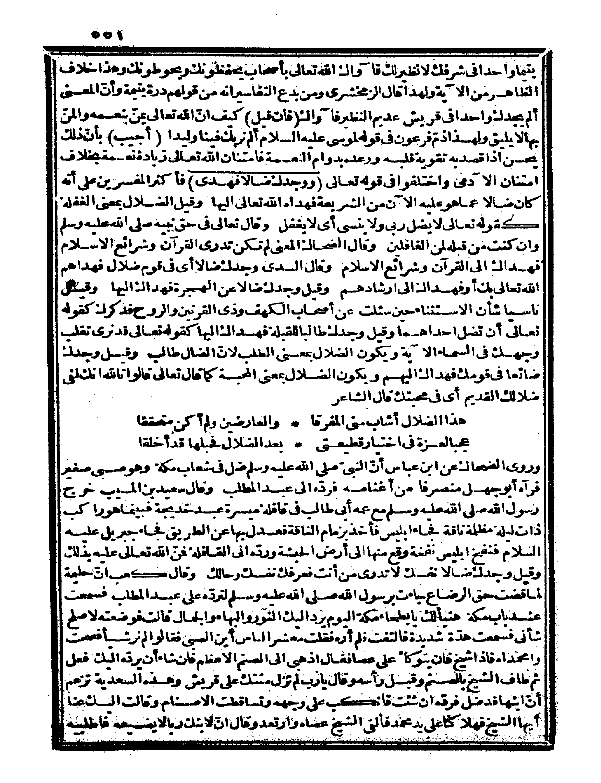 وروى الضحاك عن ابن عباس: أنّ النبيّ صلى الله عليه وسلم ضل في شعاب مكة وهو صبي صغير فرآه أبو جهل منصرفاً من أغنامه فردّه إلى عبد المطلب. وقال سعيد بن المسيب: خرج رسول الله صلى الله عليه وسلم مع عمه أبي طالب في قافلة ميسرة عبد خديجة، فبينما هو راكب ذات ليلة مظلمة ناقة فجاء إبليس فأخذ بزمام الناقة فعدل بها عن الطريق فجاء جبريل عليه السلام فنفخ إبليس نفخة وقع منها إلى أرض الحبشة وردّه إلى القافلة، فمنّ الله تعالى عليه بذلك وقيل: وجدك ضالاً نفسك لا تدري من أنت فعرفك نفسك وحالك. وقال كعب: إنّ حليمة لما قضت حق الرضاع جاءت برسول الله صلى الله عليه وسلم لتردّه على عبد المطلب فسمعت عند باب مكة هنيأ لك يا بطحاء مكة اليوم يرد إليك النور والبهاء والجمال قالت: فوضعته لأصلح شأني فسمعت هدّة شديدة فالتفت فلم أره، فقلت: معشر الناس أين الصبي؟ فقالوا: لم نر شيئاً فصحت وامحمداه فإذا شيخ فان يتوكأ على عصا، فقال: اذهبي إلى الصنم الأعظم فإن شاء أن يرده إليك فعل ثم طاف الشيخ بالصنم وقبل رأسه، وقال: يا رب لم تزل منتك على قريش وهذه السعدية تزعم أنّ ابنها قد ضلّ فردّه إن شئت فانكب على وجهه وتساقطت الأصنام، وقالت إليك عنا أيها الشيخ فهلاكنا على يد محمد فألقى الشيخ عصاه وارتعد، وقال: إنّ لابنك رباً لا يضيعه فاطلبيه
