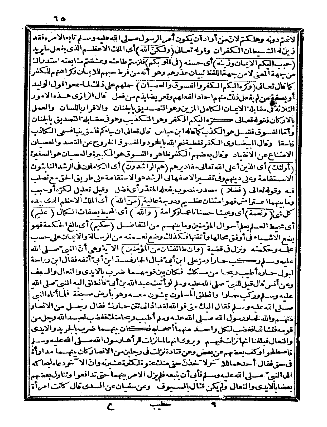 لأثمتم دونه وهلكتم. لأنّ من أراد أن يكون أمر الرسول صلى الله عليه وسلم تابعاً لأمره فقد زين له الشيطان الكفران وقوله تعالى: {ولكن الله} أي: الملك الأعظم الذي يفعل ما يريد {حبب إليكم الإيمان وزينه} أي: حسنه {في قلوبكم} فلزمتم طاعته وعشقتم متابعته استدراك من جهة المعنى لا من جهة اللفظ لبيان عذرهم، وهو أنه من فرط حبهم للإيمان وكرهتهم للكفر كما قال تعالى: {وكره إليكم الكفر والفسوق والعصيان} حملهم على ذلك ما سمعوا قول الوليد أو بصفة من لم يفعل ذلك منهم إخماداً لفعلهم وتعريضاً بذم من فعل. قال الرازي: هذه الأمور الثلاثة في مقابلة الإيمان الكامل المزين وهو التصديق بالجنان والإقرار باللسان والعمل بالأركان فقوله تعالى {كرّه إليكم الكفر} وهو التكذيب وهو في مقابلة التصديق بالجنان وأمّا الفسوق فقيل هو الكذب كما قاله ابن عباس قال تعالى {إن جاءكم فاسق بنبأ} فسمى الكاذب فاسقاً وقال البيضاوي: الكفر تغطية نعم الله بالجحود والفسوق الخروج عن القصد والعصيان الامتناع عن الانقياد. وقال بعضهم: الكفر ظاهر والفسوق هو الكبيرة والعصيان هو الصغيرة {أولئك} أي: الذين أعلى الله تعالى مقاديرهم {هم الراشدون} أي: الكاملون في الرشد الثابتون الاستقامة وعلى دينهم وفي تفسير الأصفهاني الرشد هو الاستقامة على طريق الحق مع تصلب فيه.
