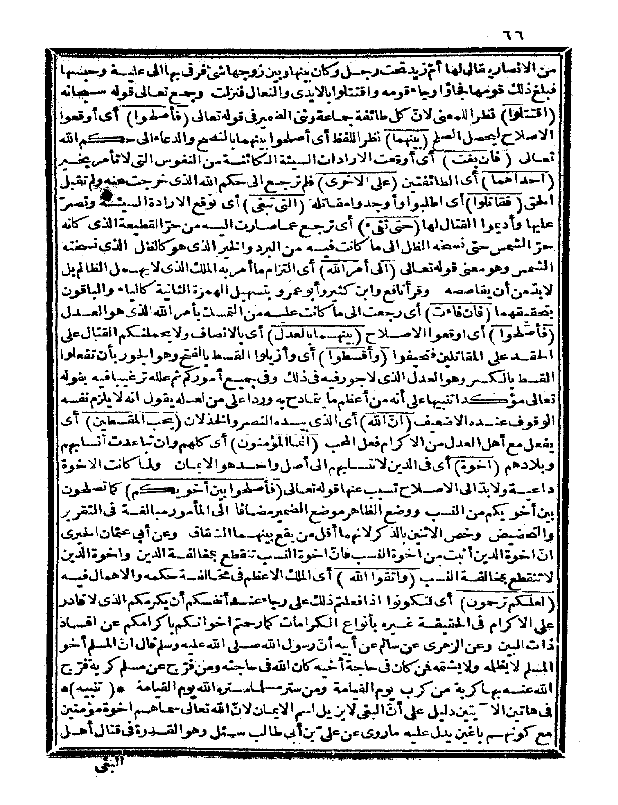 تنبيه: في هاتين الآيتين دليل على أنّ البغي لا يزيل اسم الإيمان لأنّ الله تعالى سماهم أخوة مؤمنين مع كونهم باغين يدل عليه ما روى عن عليّ بن أبي طالب سئل وهو القدوة في قتال أهل