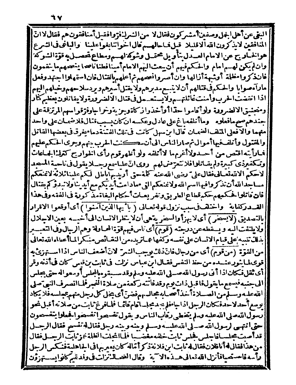 روي أنّ علياً سمع رجلاً يقول في ناحية المسجد. لا حكم إلا لله تعالى. فقال عليّ رضي الله عنه: كلمة حق أريد بها باطل لكم علينا ثلاثة لا نمنعكم مساجد الله أن تذكروا فيها اسم الله ولا نمنعكم الفيء ما دام أيديكم مع أيدينا ولا نبدئكم بقتال فإن قاتلوا فحكمهم حكم قطاع الطريق، وتفريعات أحكام البغاة مذكورة في الفقه. وفي هذا القدر كفاية.
