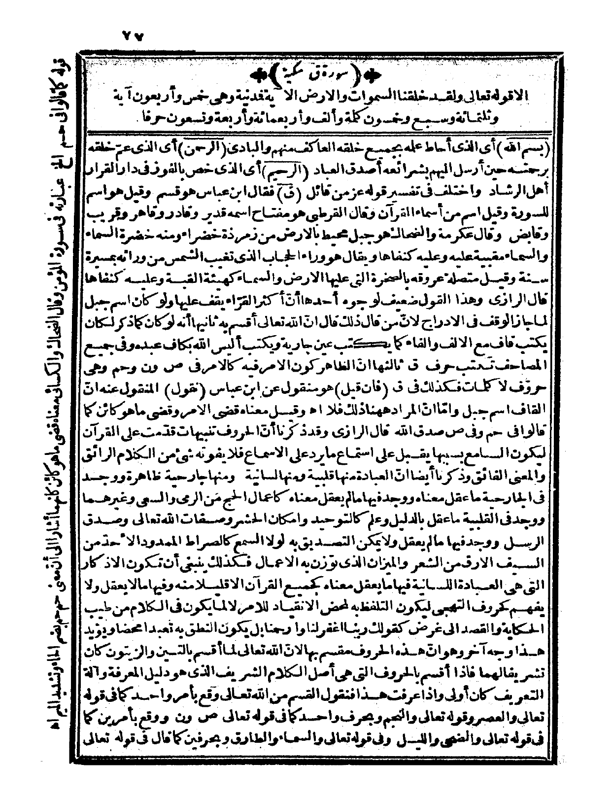 وفي جميع المصاحف تكتب حرف ق. ثالثها: أنّ الظاهر كون الأمر فيه كالأمر في ص ون وحم وهي حروف لا كلمات فكذلك في ق فإن قيل: هو منقول عن ابن عباس نقول: المنقول عنه أنّ القاف اسم جبل، وأمّا أنّ المراد ههنا ذلك فلا ا. هـ.