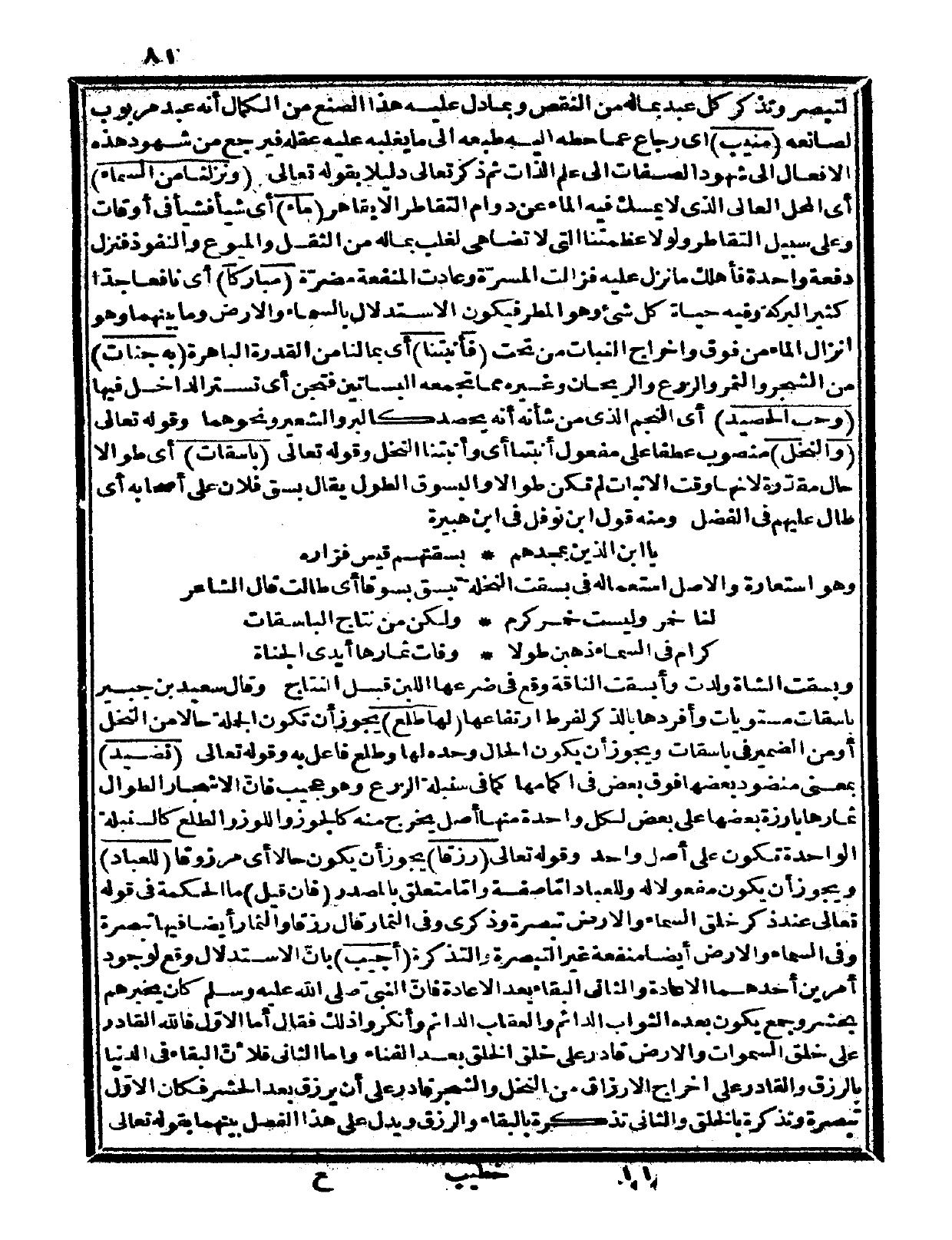 {ونزلنا من السماء} أي: المحل العالي الذي لا يمسك فيه الماء عن دوام التقاطر إلا بقاهر {ماء} أي شيئاً فشيئاً في أوقات وعلى سبيل التقاطر ولولا عظمتنا التي لا تضاهي لغلب بما له من الثقل والميوع والنفوذ فنزل دفعة واحدة فأهلك ما نزل عليه فنزل دفعة واحدة فأهلك ما نزل عليه فزالت المسرّة وعادت المنفعة مضرّة {مباركاً} أي: نافعاً جدّاً كثير لبركة وفيه حياة كل شيء، وهو المطر فيكون الاستدلال بالسماء والأرض وما بينهما وهو إنزال الماء من فوق وإخراج النبات من تحت {فأنبتنا} أي: بما لنا من القدرة الباهرة {به جناتٍ} من الشجر والثمر والزرع والريحان وغيره مما تجمعه البساتين فتجن أي تستر الداخل فيها {وحب الحصيد} أي: النجم الذي من شأنه أنه يحصد كالبر والشعير ونحوهما وقوله تعالى: