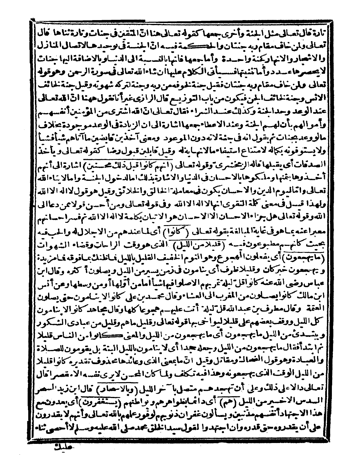 والحكمة فيه أنّ الجنة في توحيدها لاتصال المنازل والأشجار والأنهار كجنة واحدة، وأما جمعها فإنها بالنسبة إلى الدنيا وبالإضافة إليها جنات لا يحصرها عدد وأما تثنيتها فسيأتي الكلام عليها إن شاء الله تعالى في سورة الرحمن وهو قوله تعالى: {ولمن خاف مقام ربه جنتان} (الرحمن: 46)