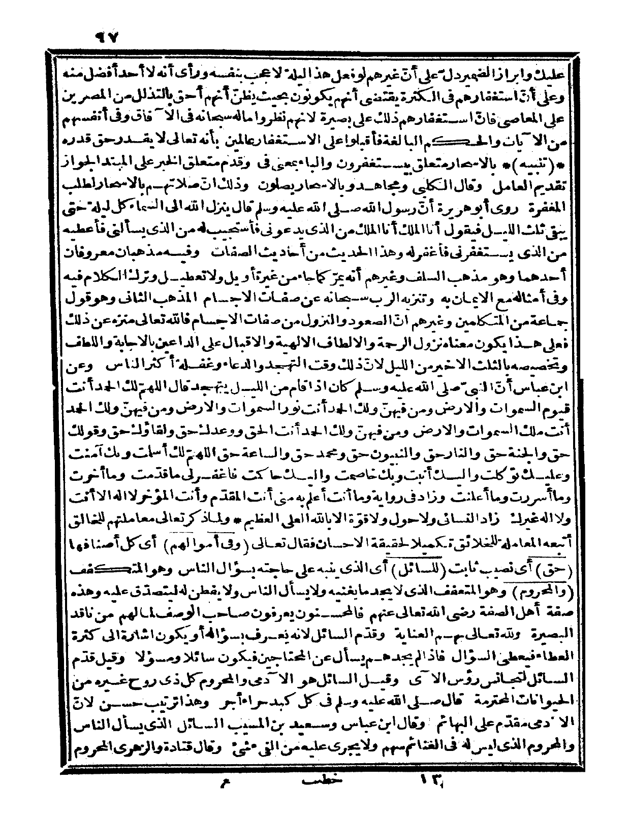 المذهب الثاني: وهو قول جماعة من المتكلمين وغيرهم أنّ الصعود والنزول من صفات الأجسام فالله تعالى منزه عن ذلك فعلى هذا يكون معناه نزول الرحمة والألطاف الإلهية والإقبال على الداعين بالإجابة واللطف وتخصيصه بالثلث الأخير من الليل، لأنّ ذلك وقت التهجد والدعاء وغفلة أكثر الناس وعن ابن عباس أنّ النبيّ صلى الله عليه وسلم كان إذا قام من الليل يتهجد قال: اللهمّ لك الحمد أنت قيوم السموات والأرض ومن فيهنّ، ولك الحمد أنت نور السموات والأرض ومن فيهنّ، ولك الحمد أنت ملك السموات والأرض ومن فيهنّ، ولك الحمد أنت الحق ووعدك حق ولقاؤك حق وقولك حق والجنة حق والنار حق والنبيون حق ومحمد حق والساعة حق اللهم لك أسلمت وبك آمنت وعليك توكلت وإليك أنبت وبك خاصمت وإليك حاكمت فاغفر لي ما قدّمت وما أخرت وما أسررت وما أعلنت» وزاد في رواية «وما أنت أعلم به مني أنت المقدّم وأنت المؤخر لا إله إلا أنت ولا إله غيرك» زاد النسائي «ولا حول ولا قوة إلا بالله العلي العظيم» .