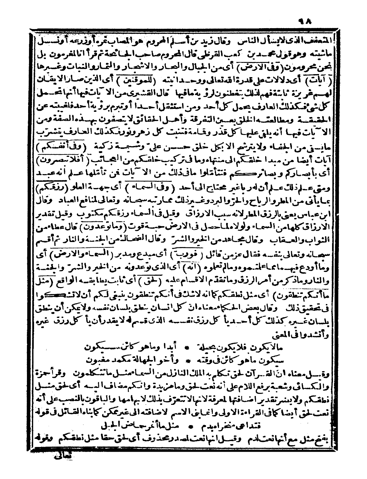 {فوربّ} أي: مبدع ومدبر {السماء والأرض} أي: وما أودع فيهما مما علمتموه وما لم تعلموه {إنه} أي: الذي توعدونه من الخير والشرّ والجنة والنار وما ذكر من أمر الرزق وما تقدّم الإقسام عليه {لحق} أي ثبات يطابقه الواقع {مثل ما أنكم تنطقون} أي مثل نطقكم كما أنه لا شك في أنكم تنطقون ينبغي لكم أن لا تشكوا في تحقيق ذلك وقال بعض الحكماء: معناه أن كل إنسان ينطق بلسان نفسه ولا يمكن أن ينطق بلسان غيره، كذلك كل أحد يأكل رزق نفسه الذي قسم له لا يقدر أن يأكل رزق غيره وأنشدوا في المعنى: