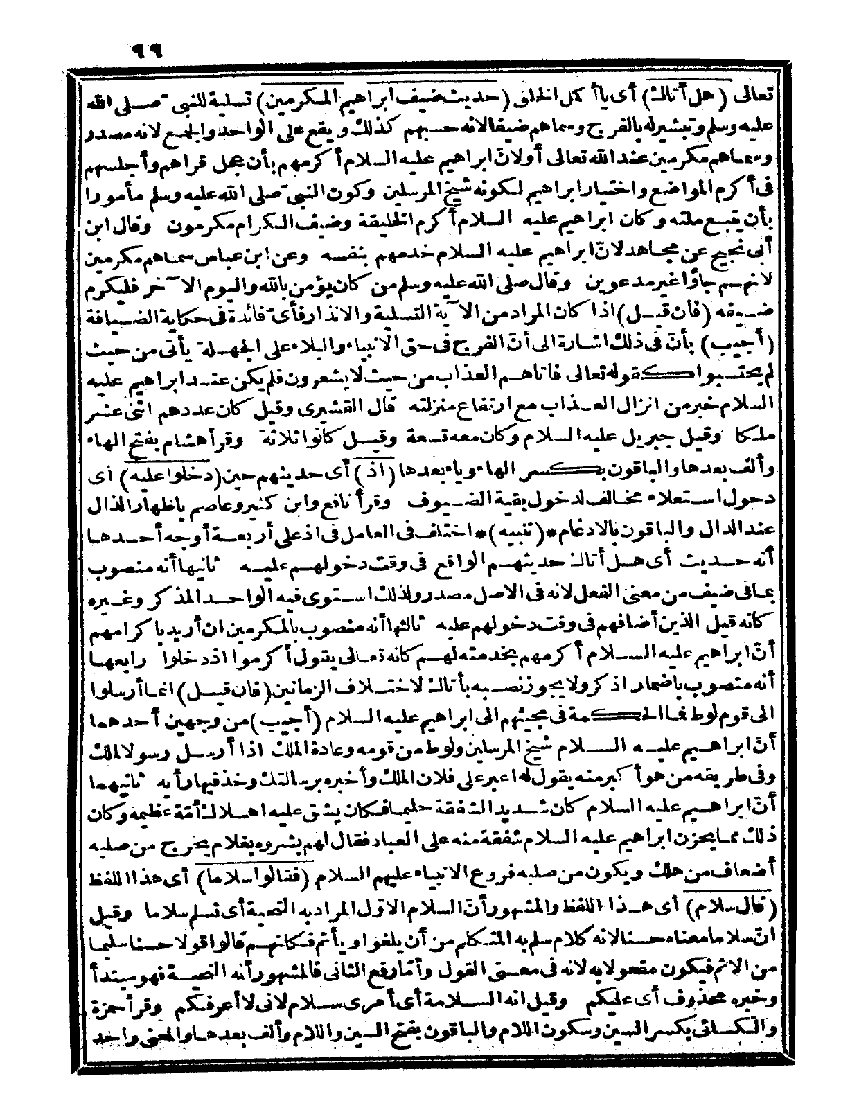 فإن قيل: إنما أرسلوا إلى قوم لوط فما الحكمة في مجيئهم إلى إبراهيم عليه السلام؟ أجيب من وجهين: أحدهما: أن إبراهيم عليه السلام شيخ المرسلين ولوط من قومه، وعادة الملك إذا أرسل رسولاً لملك وفي طريقه من هو أكبر منه يقول له: اعبر على فلان الملك وأخبره برسالتك وخذ فيها رأيه. ثانيهما: أن إبراهيم عليه السلام كان شديد الشفقة حليماً فكان يشق عليه إهلاك أمّة عظيمة، وكان ذلك مما يحزن إبراهيم عليه السلام شفقة منه على العباد، فقال لهم: بشروه بغلام يخرج من صلبه أضعاف من هلك ويكون من صلبه فروع الأنبياء عليهم السلام {فقالوا سلاماً} أي هذا اللفظ. {قال سلامٌ} أي: هذا اللفظ، والمشهور أنّ السلام الأوّل المراد به التحية أن نسلم سلاماً، وقيل: إن سلاماً معناه حسناً؛ لأنه كلام سلم به المتكلم من أن يلغو ويأثم، فكأنهم قالوا قولاً حسناً سليماً من الإثم فيكون مفعولاً به، لأنه في معنى القول، وأمّا رفع الثاني فالمشهور أنه التحية فهو مبتدأ وخبره محذوف أي عليكم، وقيل: إنه السلامة، أي: أمري سلام لأني لا أعرفكم، وقرأ حمزة والكسائي بكسر السين وسكون اللام والباقون بفتح السين واللام وألف بعدها والمعنى واحد.