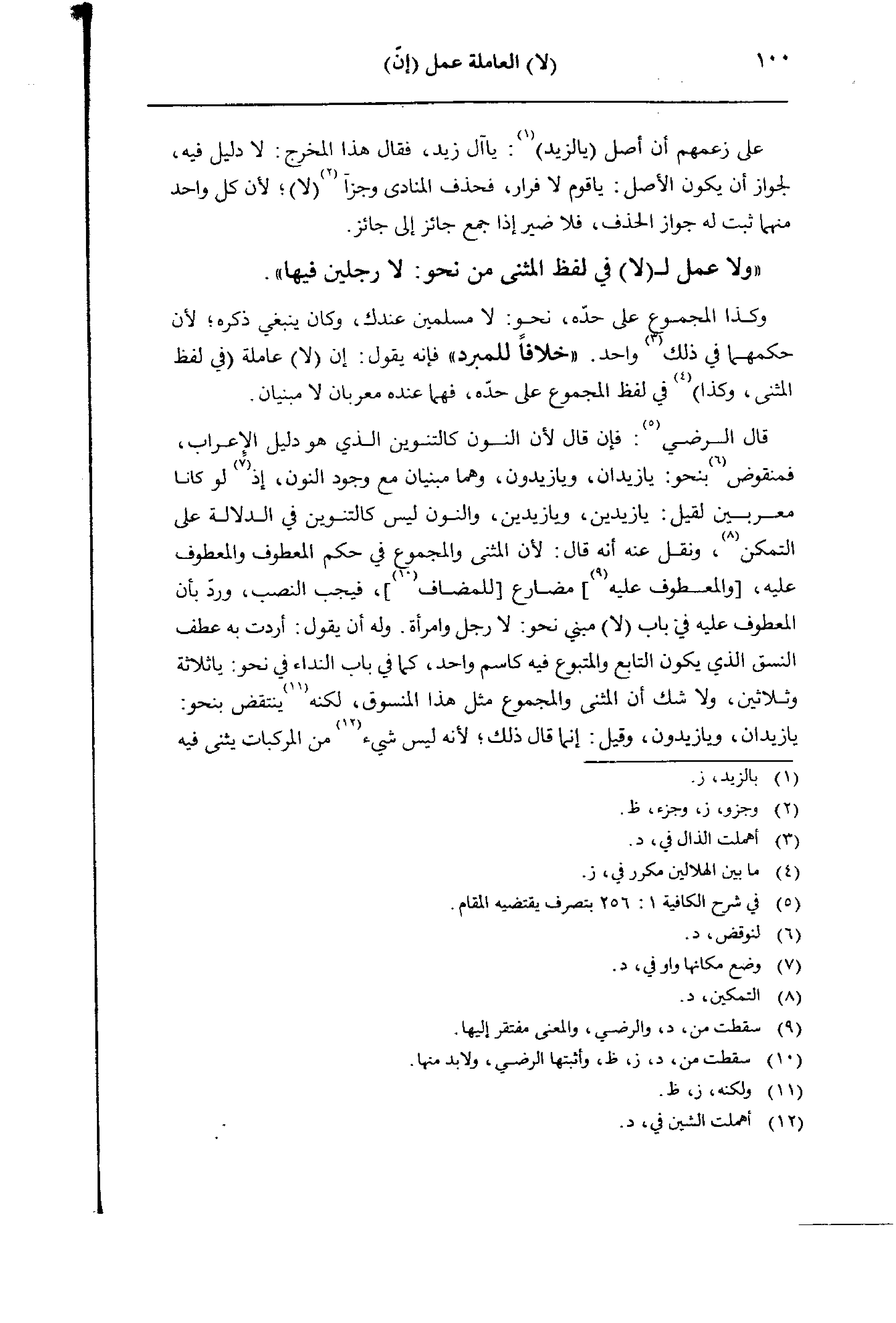 «ولا عمل لـ (لا) في لفظ المثنى من نحو: لا رجلين فيها».