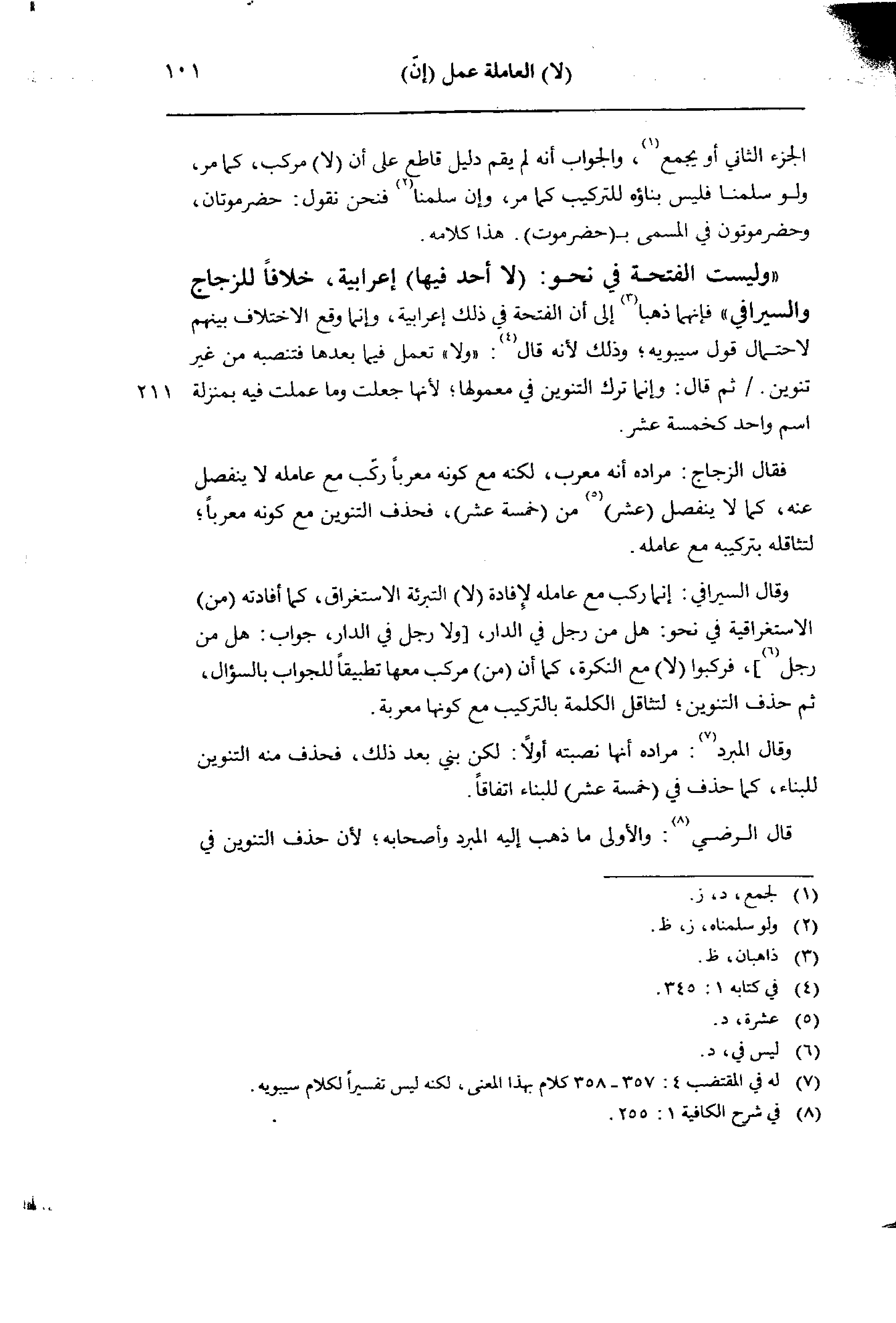 «وليست الفتحة في نحو: (لا أحد فيها) إعرابية، خلافا للزجاج والسيرافي» فإنهما ذهبا إلى أن الفتحة في ذلك إعرابية، وإنما وقع الاختلاف بينهم لاحتمال قول سيبويه؛ وذلك لأنه قال: «ولا» تعمل فيما بعدها فتنصبه من غير تنوين. /ثم قال: وإنما ترك التنوين في معمولها؛ لأنها جعلت وما عملت فيه بمنزلة اسم واحد كخمسة عشر.