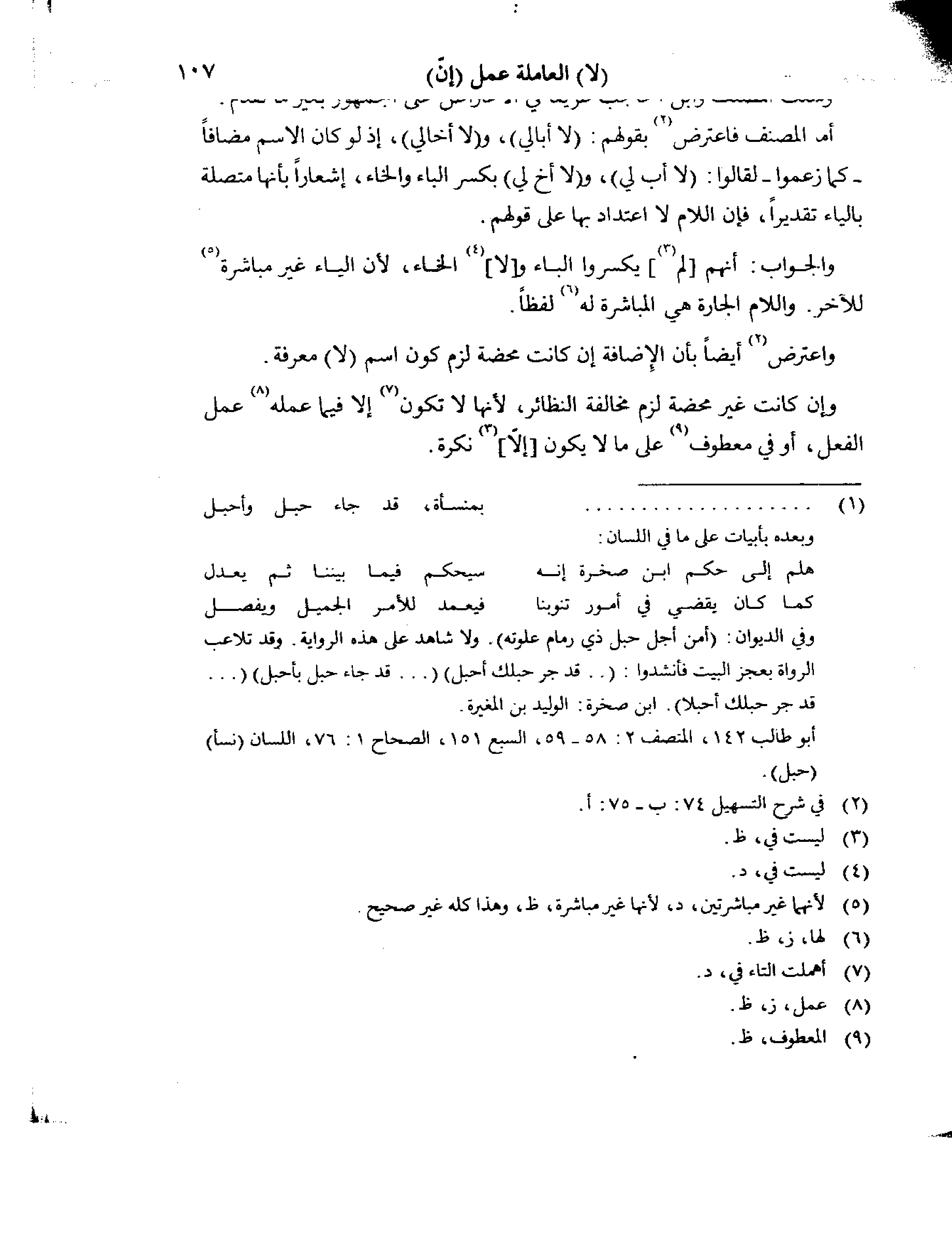 أما المصنف فاعترض بقولهم: (لا أبالي)، و (لا أخالي)، إذ لو كان الاسم مضافا-كما زعموا- لقالوا: (لا أب لي)، و (لا أخ لي) بكسر الباء والخاء، إشعارا بأنها متصلة بالياء تقديرا، فإن اللام لا اعتداد بها على قولهم.