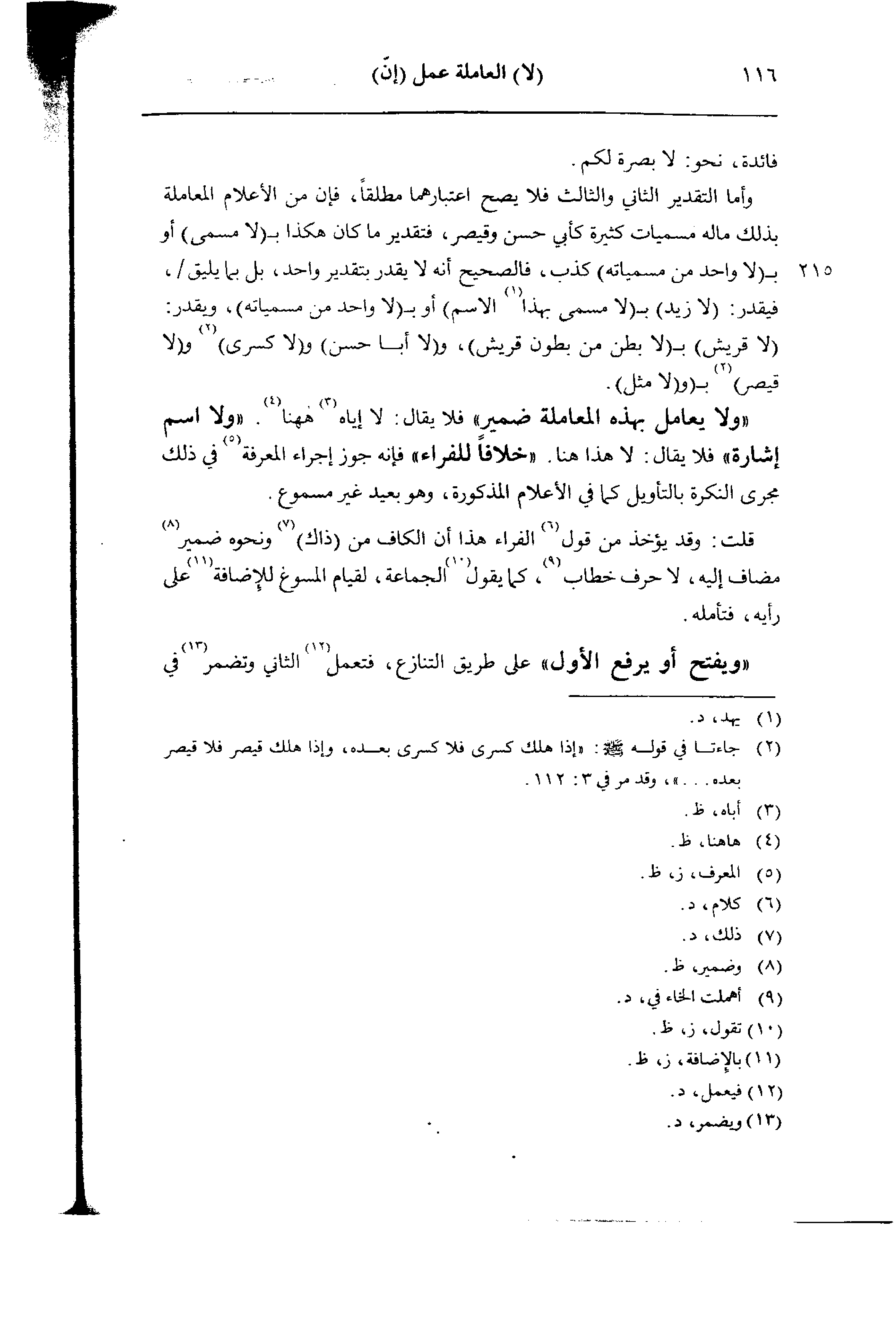 «ولا يعامل بهذه المعاملة ضمير» فلا يقال: لا إياه ههنا. «ولا اسم إشارة» فلا يقال: لا هذا هنا. «خلافًا للفراء» فإنه جوز إجراء المعرفة في ذلك مجرى النكرة بالتأويل كما في ا؟ لأعلام المذكورة، وهو بعيد غير مسموع.