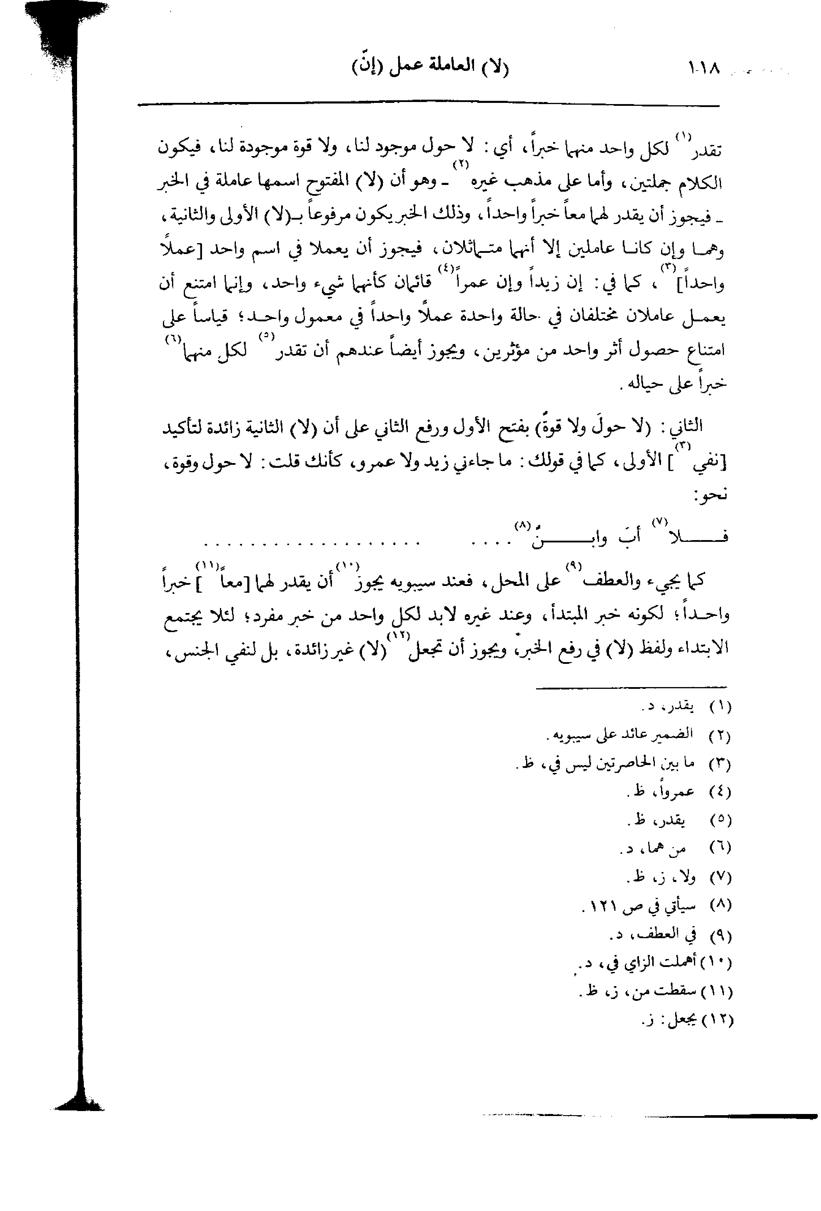 تقدر لكل واجد منهما خبرًا، أي: لا حول موجود لنا، ولا قوة موجودة لنا، فيكون الكلام جملتين، وأما على مذهب غيره- وهو أن (لا) المفتوح اسمها عاملة في الخبر- فيجوز أن يقدر لهما معًا خبرًا واحدًا، وذلك الخبر يكون مرفوعًا بـ (لا) الأولى والثانية، وهما وإن كانا عاملين إلا أنهما متماثلان، فيجوز أن يعملا في اسم واحد [عملًا واحدًا]، كما في: إن زيدًا وإن عمرًا قائمان كأنهما شيء واحد، وإنما امتنع أن يعمل عاملان مختلفان في حالة واحدة عملًا واحدًا في معمول واحد؛ قياسًا على امتناع حصول أثر واحد من مؤثرين، ويجوز أيضًا عندهم أن تقدر لكل منهما خبرًا على حياله.
