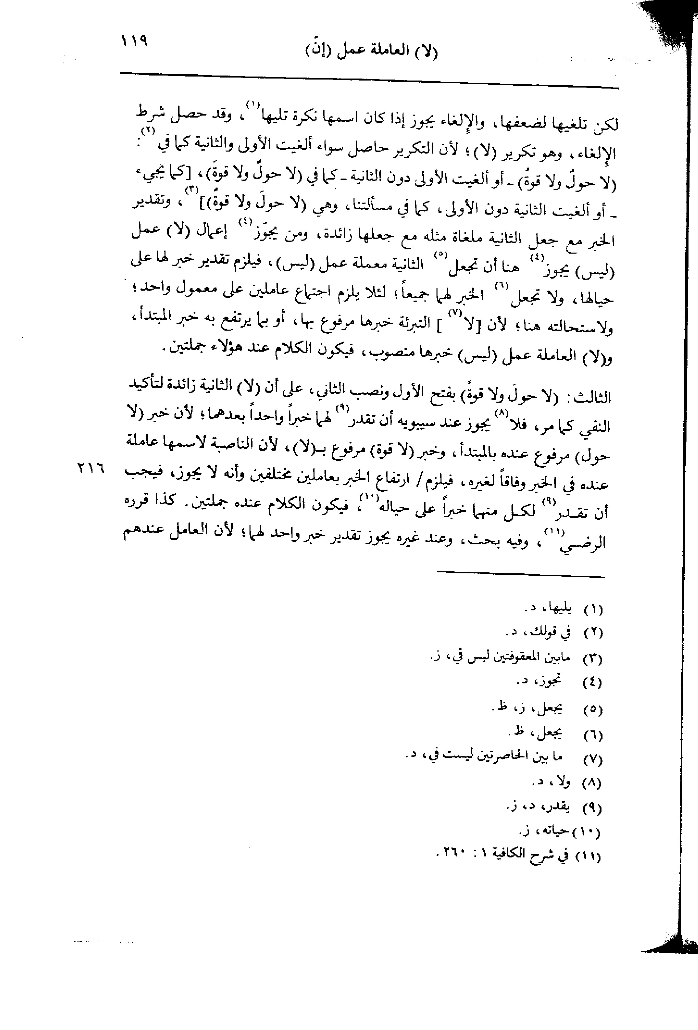 لكن تلغيها لضعفها، والإلغاء يجوز إذا كان اسمها نكرة تليها، وقد حصل شرط الإلغاء، وهو تكرير (لا)؛ لأن التكرير حاصل سواء ألغيت الأولى والثانية كما في: (لا حول ولا قوة) - أو ألغيت الأولى دون الثانية- كما في (لا حول ولا قوة)، كما يجيء- أو ألغيت الثانية دون الأولى، كما في مسألتنا، وهي (لا حول ولا قوة)]، وتقدير الخبر مع جعل الثانية ملغاة مثله مع جعلها زائدة، ومن يجوز إعمال (لا) عمل (ليس) يجوز هنا أن تجعل الثانية معملة عمل (ليس)، فيلزم تقدير خبر لها على حيالها، ولا تجعل الخبر لهما جميعًا، لئلا يلزم اجتماع عاملين على معمول واحد؛ ولاستجالته هنا؛ لأن [لا] التبرئة خبرها مرفوع بها، أو بما يرتفع به خبر المبتدأ، و (لا) العاملة عمل (ليس) خبرها منصوب، فيكون الكلام عند هؤلاء جملتين.