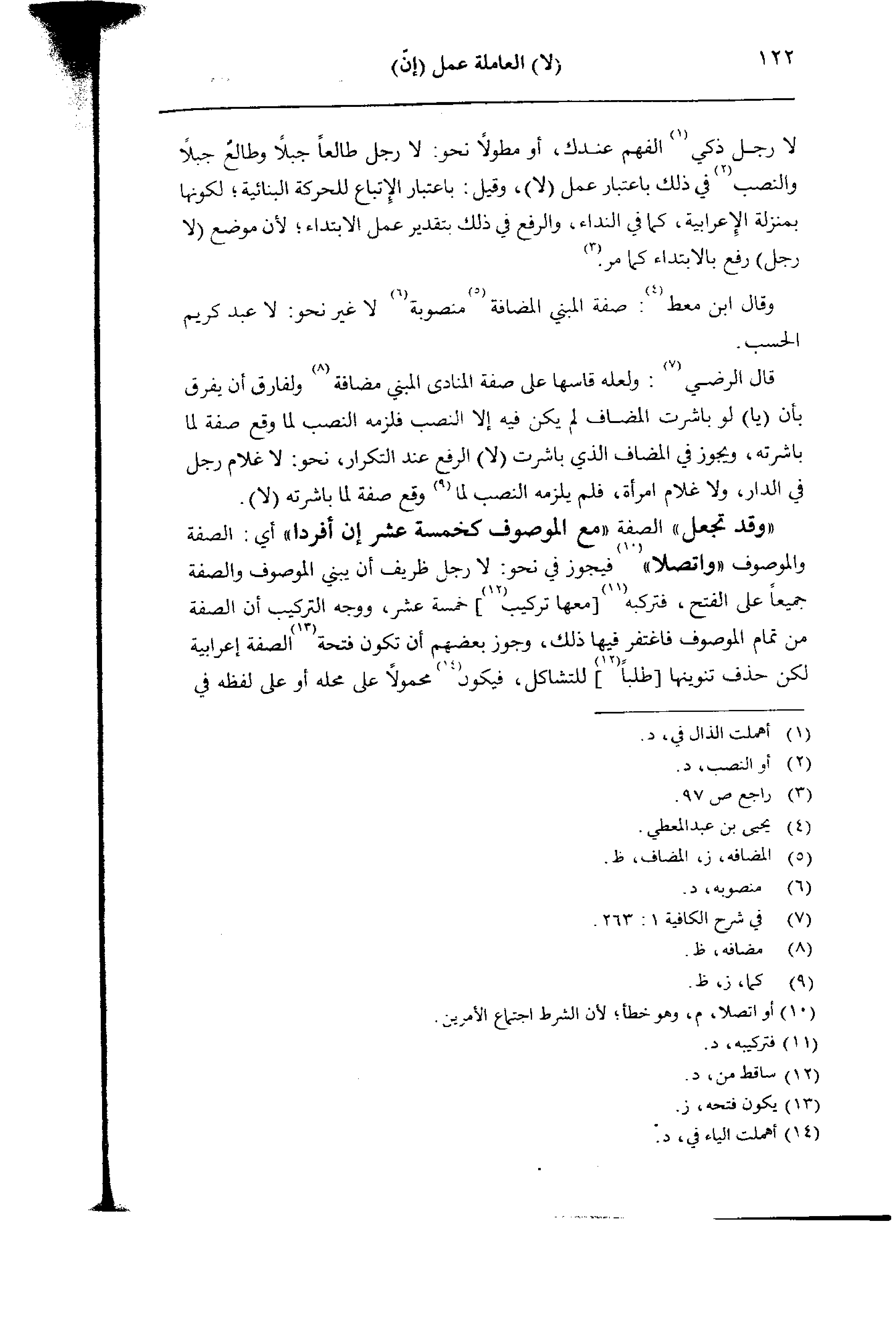 قال الرضي: ولعله قاسها على صفة المنادي مضافة ولفارق أن يفرق بأن (يا) لو باشرت المضاف لم يكن فيه إلا النصب فلزمه النصب لما وقع صفة لما باشرته، ويجوز في المضاف الذي باشرت (لا) الرفع عند التكرار، نحو: لا غلام رجل في الدار، ولا غلام امرأة، فلم يلزمه النصب لما وقع صفة لما باشرته (لا).