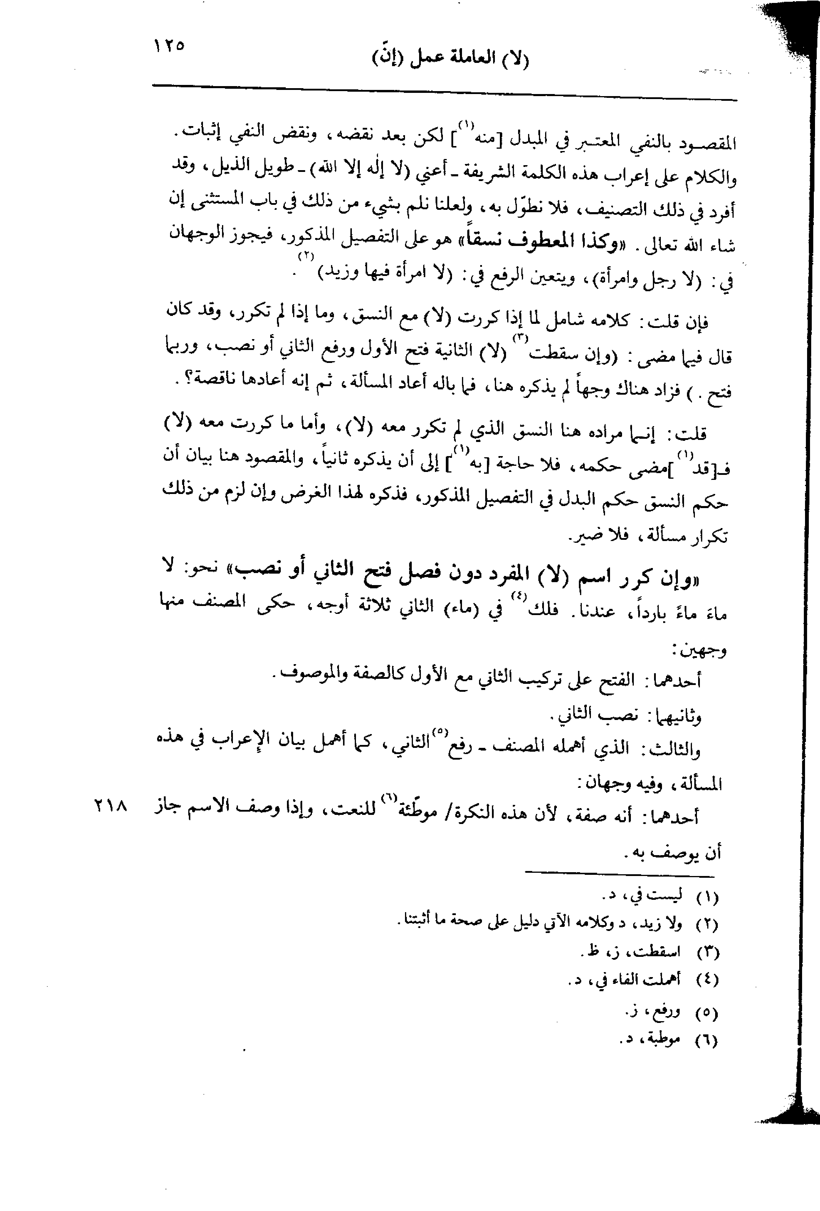 والكلام على إعراب هذه الكلمة الشريفة- أعنى (لا إله إلا الله) - طويل الذيل، وقد أفرد في ذلك التصنيف، فلا نطول به، ولعلنا نلم بشيء من ذلك في باب المستثني إن شاء الله تعالى. «وكذا المعطوف نسقًا» هو على التفصيل المذكور، فيجوز الوجهان في: (لا رجل وامرأة)، ويتعين الرفع في (لا امرأة فيها وزيد).