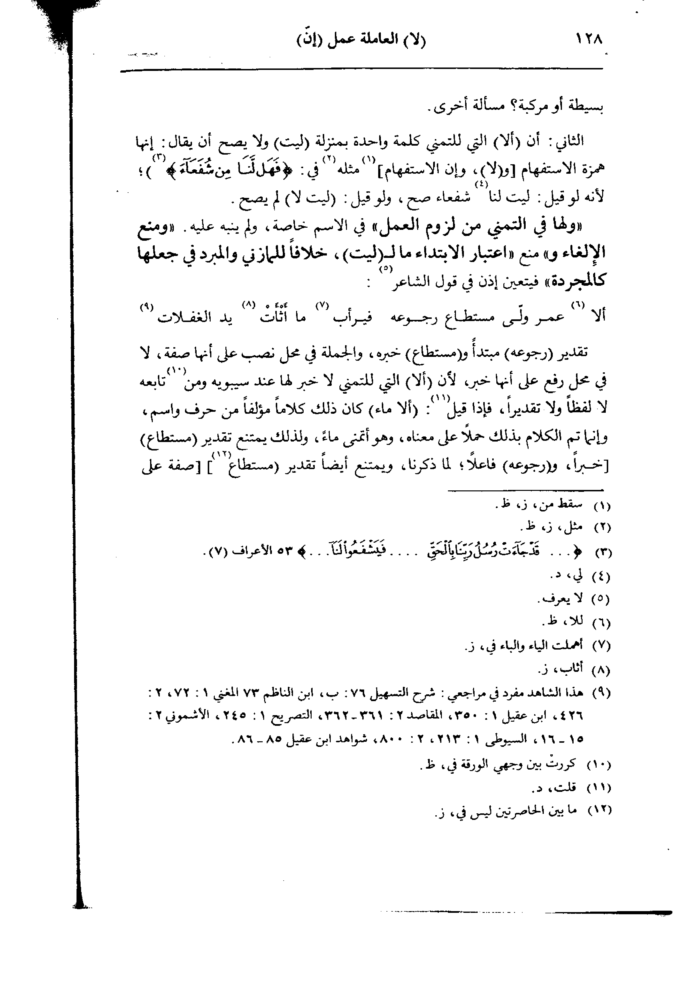 «ولها في التمني من لزوم العمل» في الاسم خاصة، ولم ينبه عليه. «ومنع الإلغاء و» منع «اعتبار الابتداء ما لـ (ليت)، خلافًا للمازني والمبرد في جعلها كالمجردة» فيتعين إذن في قول الشاعر:
