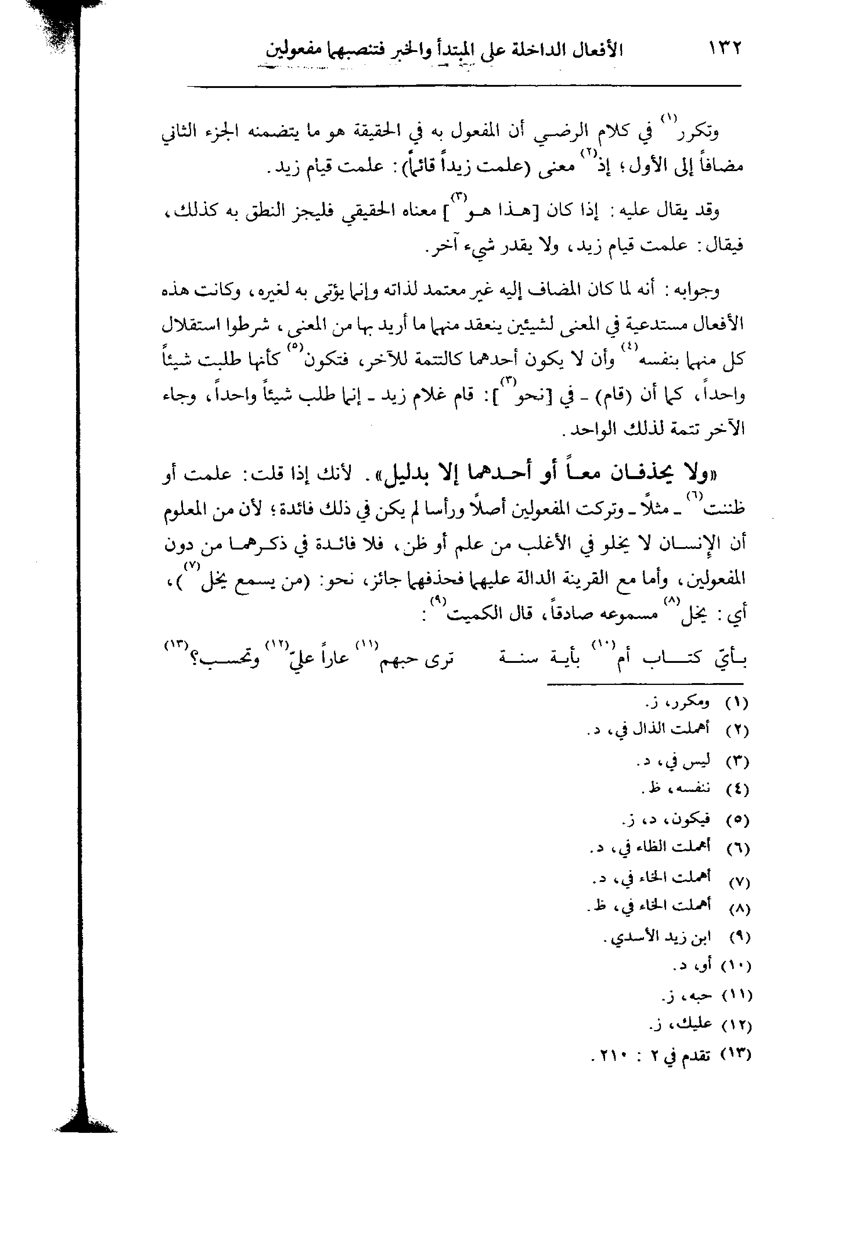 وتكرر في كلام الرضي أن المفعول به في الحقيقة هو ما يتضمنه الجزء الثاني مضافًا إلى الأول؛ إذ معنى (علمت زيدًا قائمًا): علمت قيام زيد.
