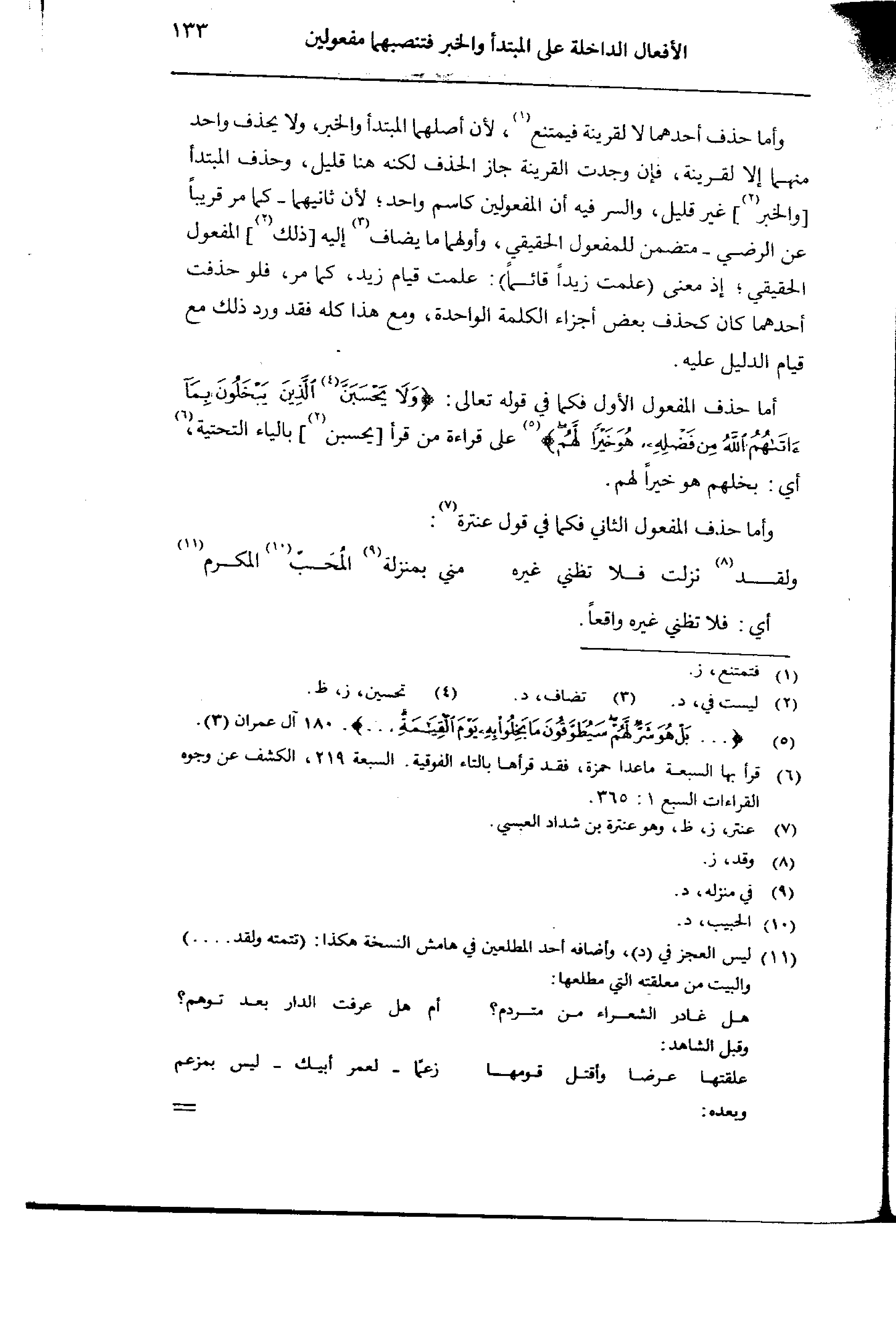 وأما حذف أحدهما لا لقرينة فيمتنع، لأن أصلهما المبتدأ والخبر، ولا يحذف واحد منهما إلا لقرينه، فإن وجدت القرينة جاز الحذف لكنه قليل، وحذف المبتدأ [والخبر] غير قليل، والسر فيه أن المفعولين كاسم واحد؛ لأن ثانيهما- كما مر قريبًا عن الرضي- متضمن للمفعول الحقيقي، وأولهما ما يضاف إليه [ذلك] المفعول الحقيقي؛ إذ معنى (علمت زيدًا قائمًا): علمت قيام زيد، كما مر، فلو حذفت أحدهما كان كحذف بعض أجزاء الكلمة الواحدة، ومع هذا كله فقد ورد ذلك مع قيام الدليل عليه.