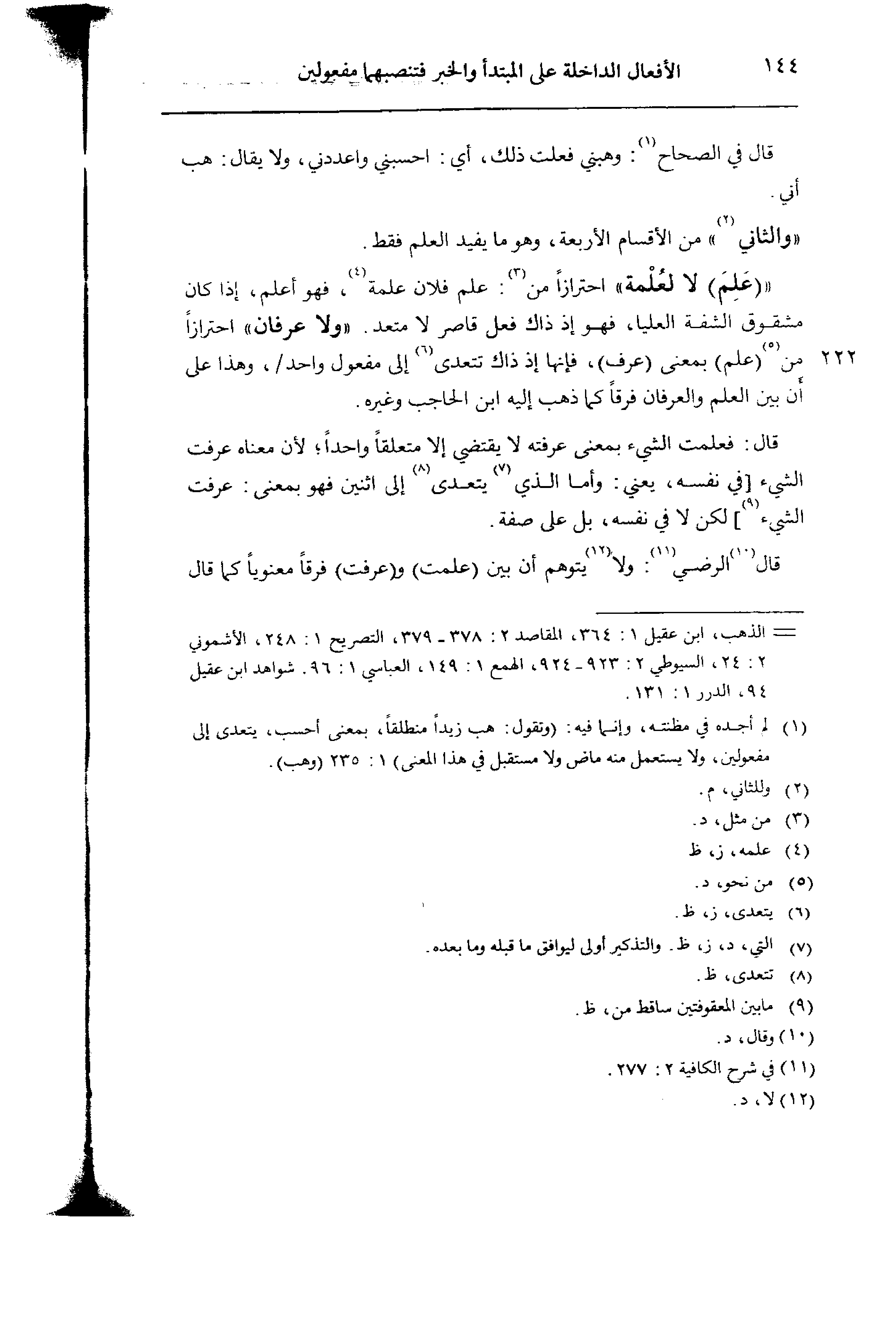 «(علم) لا لعلمة» احترازًا من: علم فلان علمة، فهو أعلم، إذا كان مشقوق الشفة العليا، فهو إذ ذاك فعل قاصر لا متعد. «ولا عرفان» احترازًا 222 من (علم) بمعنى (عرف)، فإنها إذ ذاك تتعدى إلى مفعول واحد/، وهذا على أن بين العلم والعرفان فرقًا كما ذهب إليه ابن الحاجب وغيره.