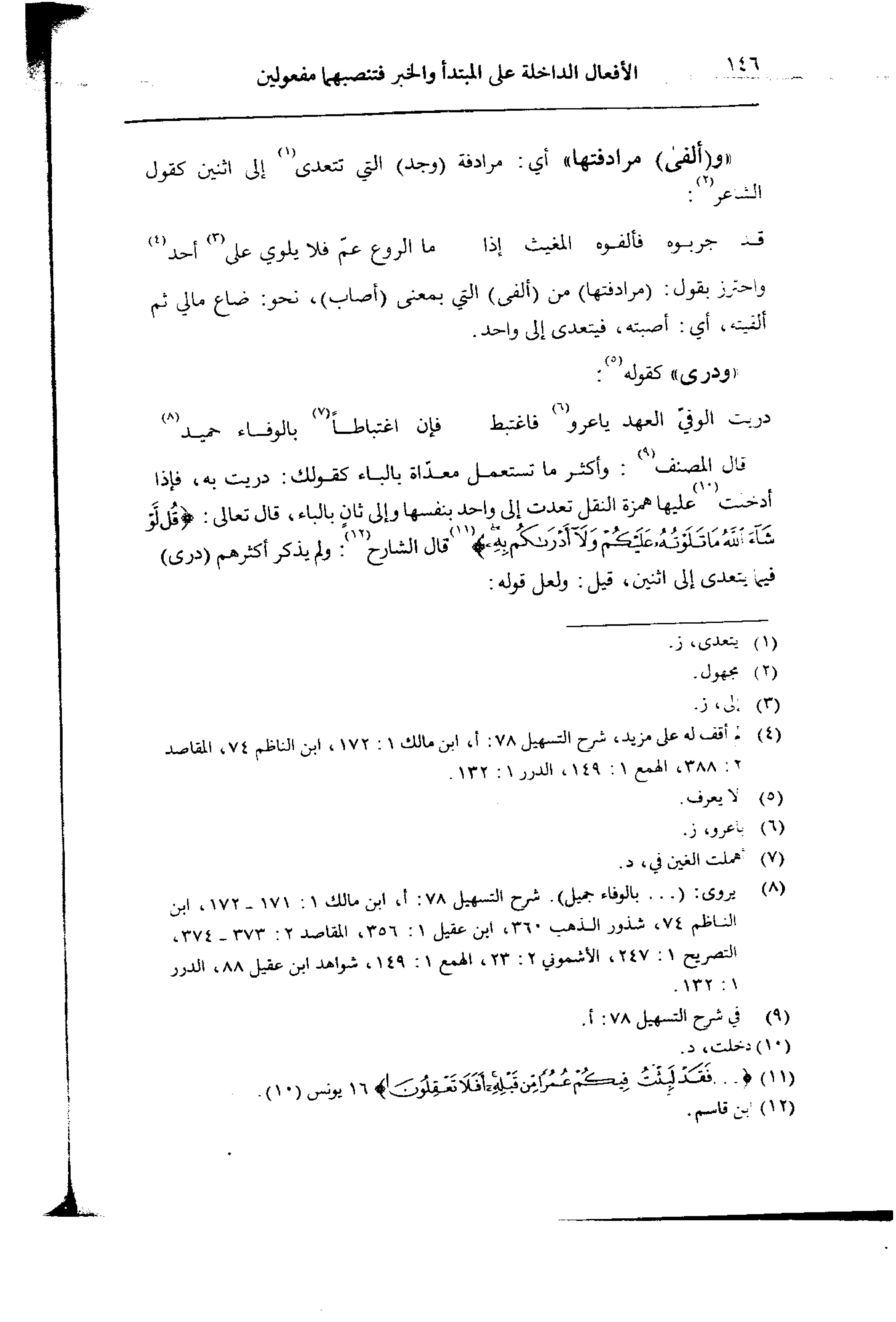 قال المصنف: وأكثر ما تستعمل معداة بالباء كقولك: دريت به، فإذا أدخت عليها همزة النقل تعددت إلى واحد بنفسها وإلى ثان بالباء، قال تعالى: {قل لو شاء الله ما تلوته عليكم ولا أدرئكم به} قال الشارح: ولم يذكر أكثرهم (درى) فيما يتعدى إلى اثنين، قيل: ولعل قوله: