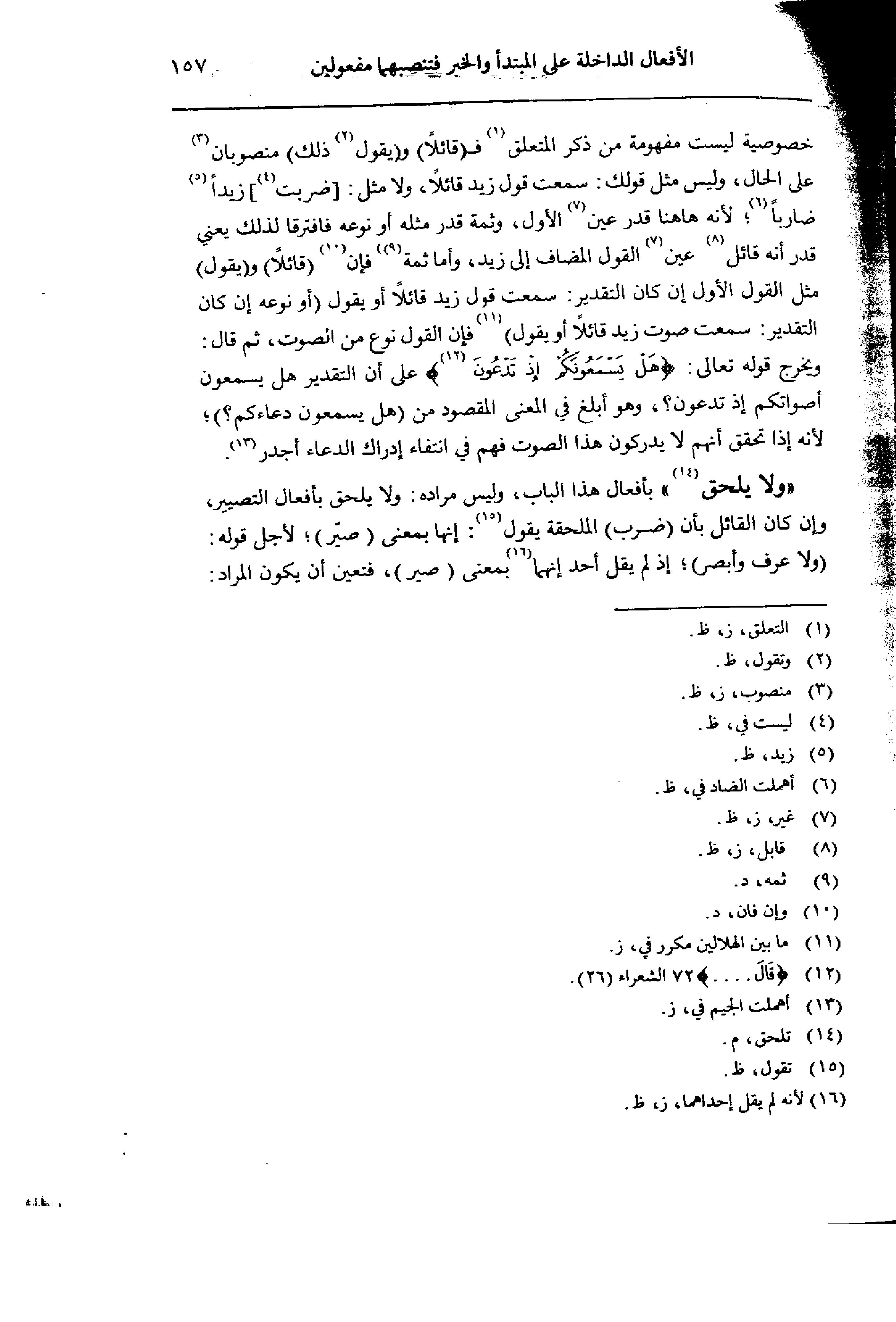 خصوصية ليست مفهومة من ذكر المتعلق فـ (قائلًا) و (يقول ذلك) منصوبان على الحال، وليس مثل قولك: سمعت قول زيد قائلًا، ولا مثل: [ضربت] زيدًا ضاربًا؛ لأنه ها هنا قدر عين الأول، وثمة قدر مثله أو نوعه فافترقًا لذلك يعني قدر أنه قائل عين القول المضاف إلى زيد، وأما ثمة فإن (قائلًا) و (يقول) مثل القول الأول إن كان التقدير: سمعت قول زيد قائلًا أو يقول (أو نوعه إن كان التقدير: سمعت صوت زيد قائلًا أو يقول) فإن القول نوع من الصوت، ثم قال: ويخرج قوله تعالى: {هل يسمعونكم إذ تدعون} على أن التقدير هل يسمعون أصواتكم إذ تدعون؟ ، وهو أبلغ في المعنى المقصود من (هل يسمعون دعاءكم؟ )؛ لأنه إذا تحقق أنهم لا يدركون هذا الصوت فهم في انتفاء إدراك الدعاء أجدر.