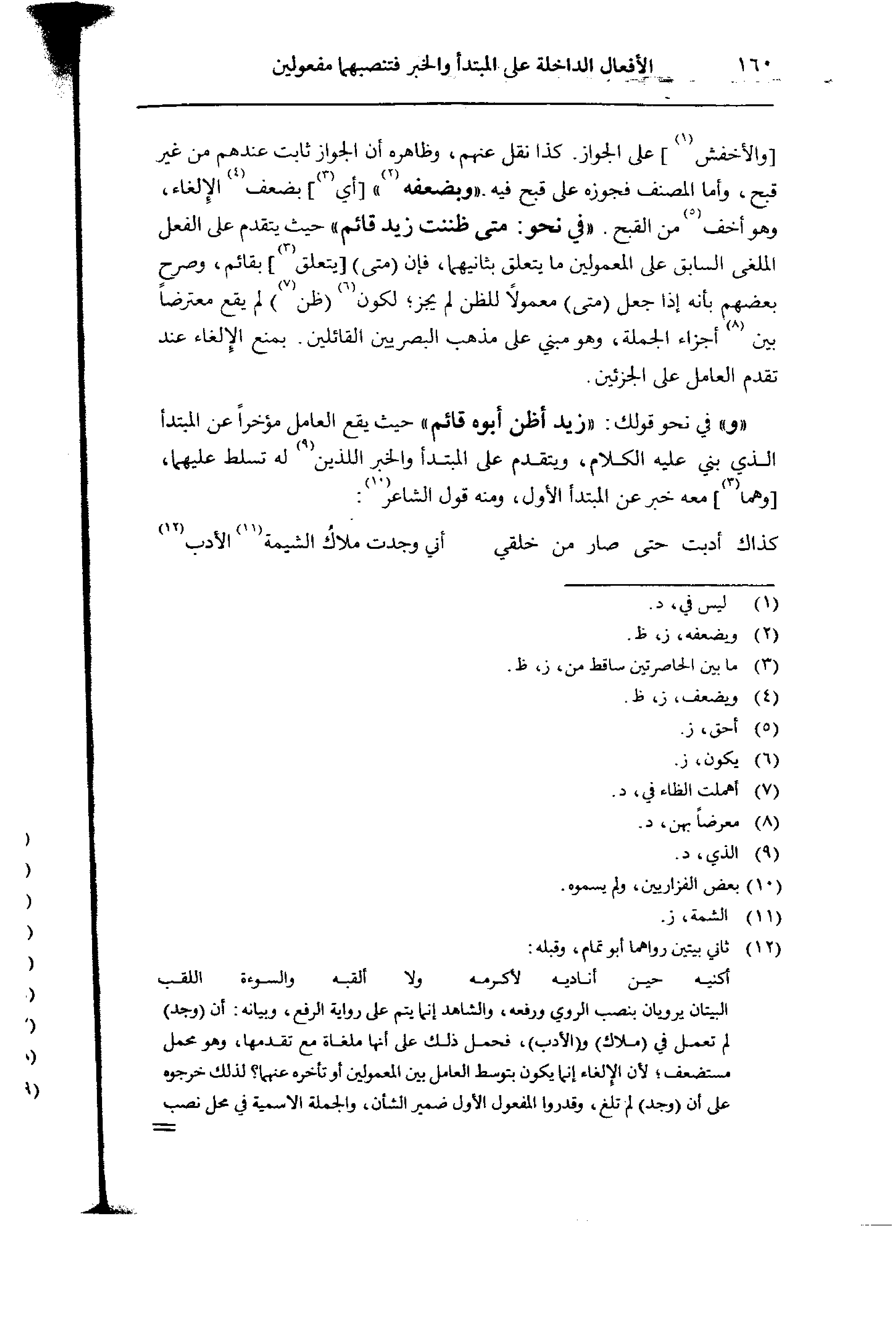 [والأخفش] على الجواز. كذا نقل عنهم، أن الجواز ثابت عندهم من غير قبح، وأما المصنف فجوزه على قبح فيه. «وبضعفه» [أي] بضعف الإلغاء، وهو أخف من القبح. «في نحو: متى ظننت زيد قائم» حيث يتقدم على الفعل الملغي السابق على المعمولين ما يتعلق بثانيهما، فإن (متى) [يتعلق] بقائم، وصرح بعضهم بأنه إذا جعل (متى) معمولًا للظن لم يجز؛ لكون (ظن) لم يقع معترضًا بين أجزاء الجملة، وهو مبنى على مذهب البصريين القائلين. بمنع الإلغاء عند تقدم العامل على الجزئيين.