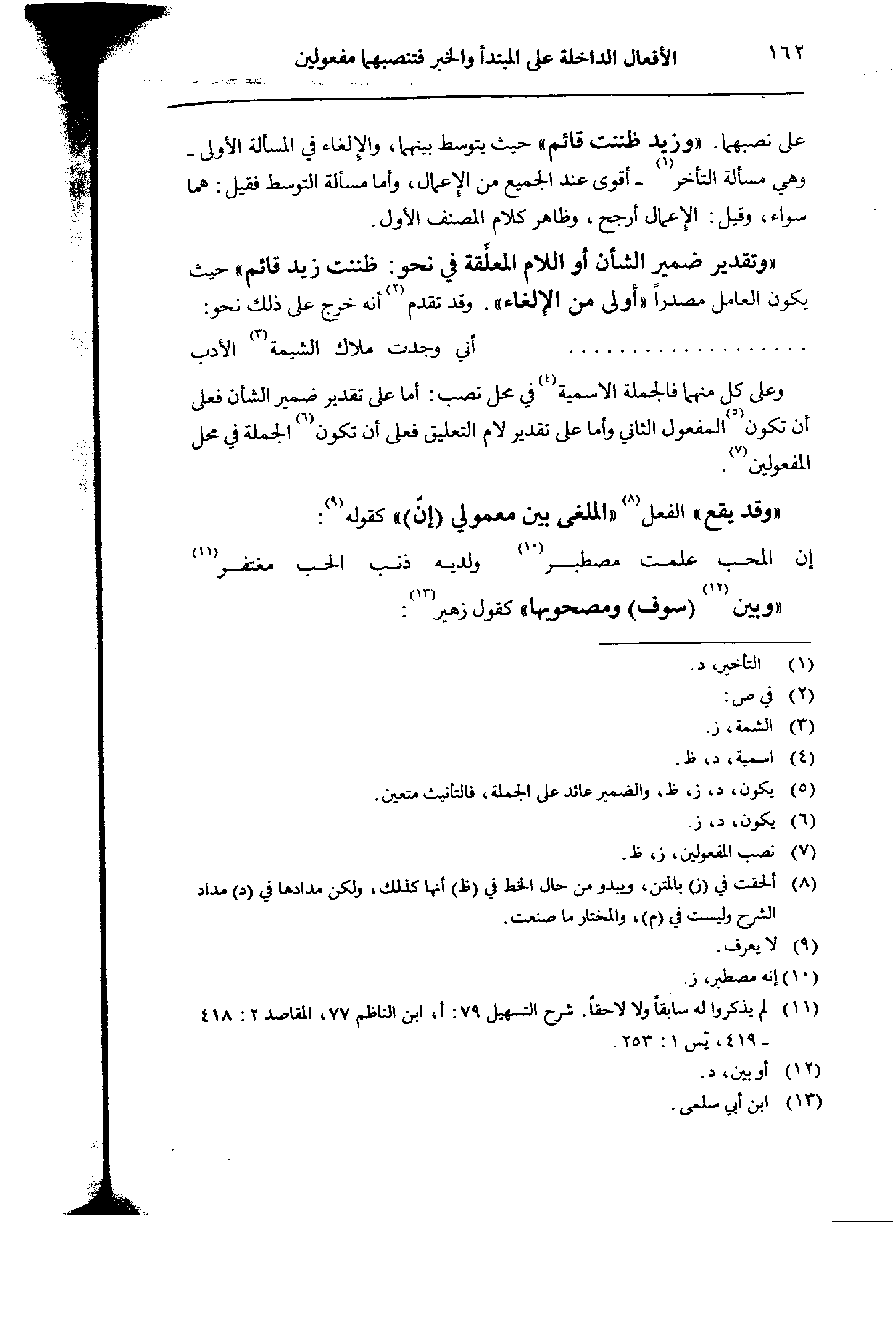 «وتقدير ضمير الشأن أو اللام المعلقة في نحو: ظننت زيد قائم» حيث يكون العامل مصدرًا «أولى من الإلغاء». وقد تقدم أنه خرج على ذلك نحو:
