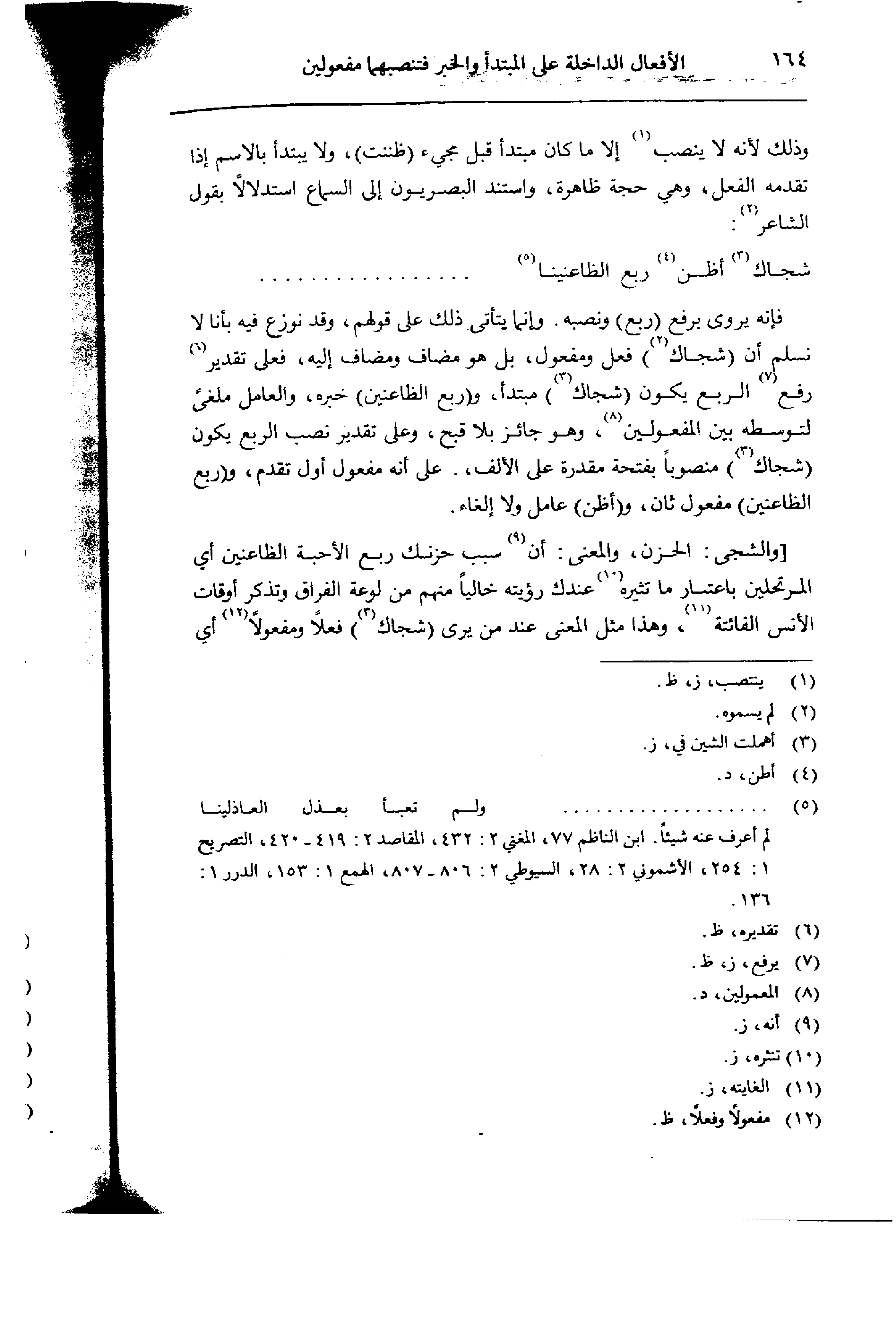 فإنه يروى برفع (ربع) ونصبه. وإنما يتأتى ذلك على قولهم، وقد نوزع فيه بأنا لا نسلم أن (شجاك) فعل ومفعول، بل هو مضاف ومضاف إليه، فعلى تقدير رفع الربع يكون (شجاك) مبتدأ، و (ربع الظاعنين) خبره، والعامل ملغى لتوسطه بين المفعولين، وهو جائز بلا قبح، وعلى تقدير نصب الربع يكون (شجاك) منصوبًا بفتحة مقدرة على الألف، . على أنه مفعول أول تقدم، و (ربع الظاعنين) مفعول ثان، و (أظن) عامل ولا إلغاء.