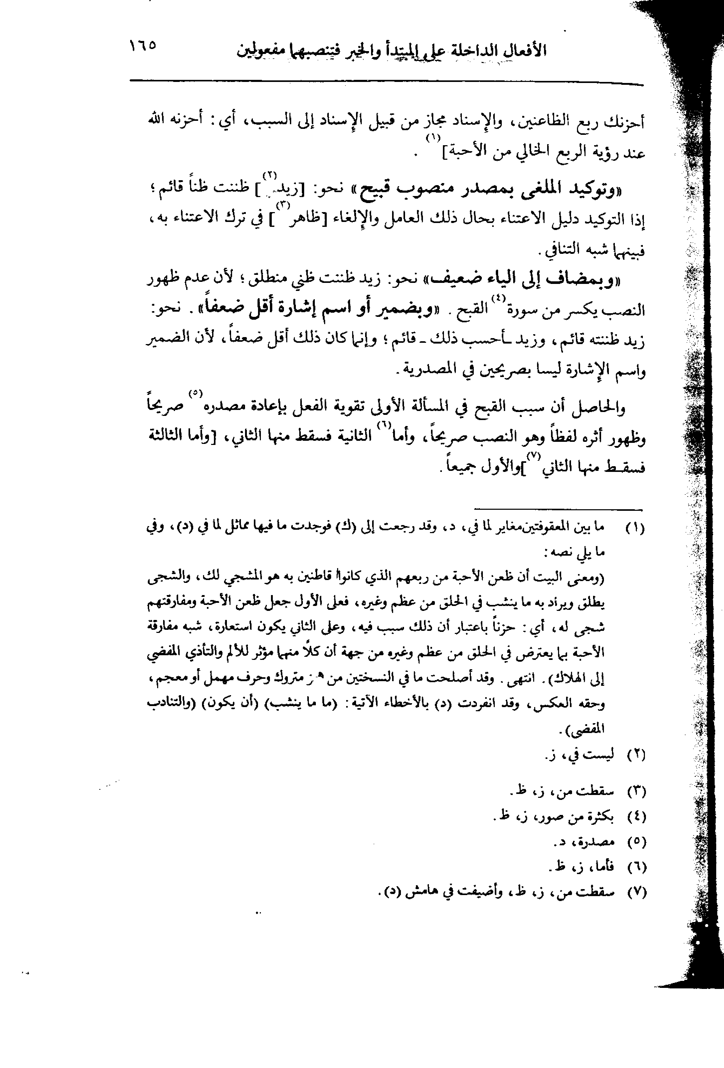 «وبمضاف إلى الياء ضعيف» نحو: زيد ظننت ظني منطلق؛ لأن عدم ظهور النصب بكسر من سورة القبح. «وبضمير أو اسم إشارة أقل ضعفًا. نحو: زيد ظننته قائم، وزيد- أحسب ذلك- قائم؛ وإنما كان ذلك أقل ضعفًا»، لأن الضمير واسم الإشارة ليسا بصريحين في المصدرية.