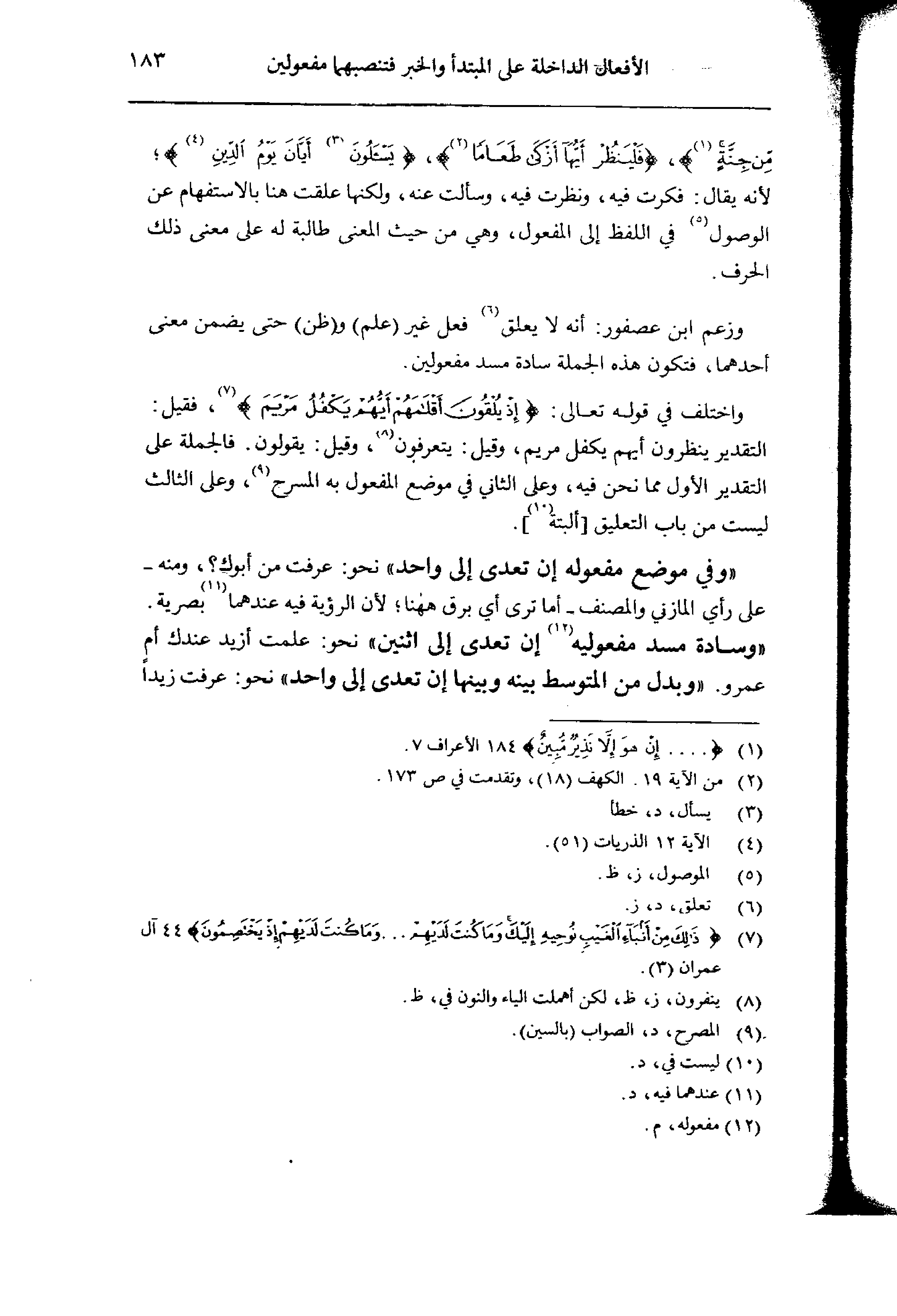 «وفي موضع مفعوله إن تعدى إلى واحد» نحو: عرفت من أبوك؟ ، ومنه- على رأي المازني والمصنف- أما ترى أي برق ههنا؛ لأن الرؤية فيع عندهما بصرية.