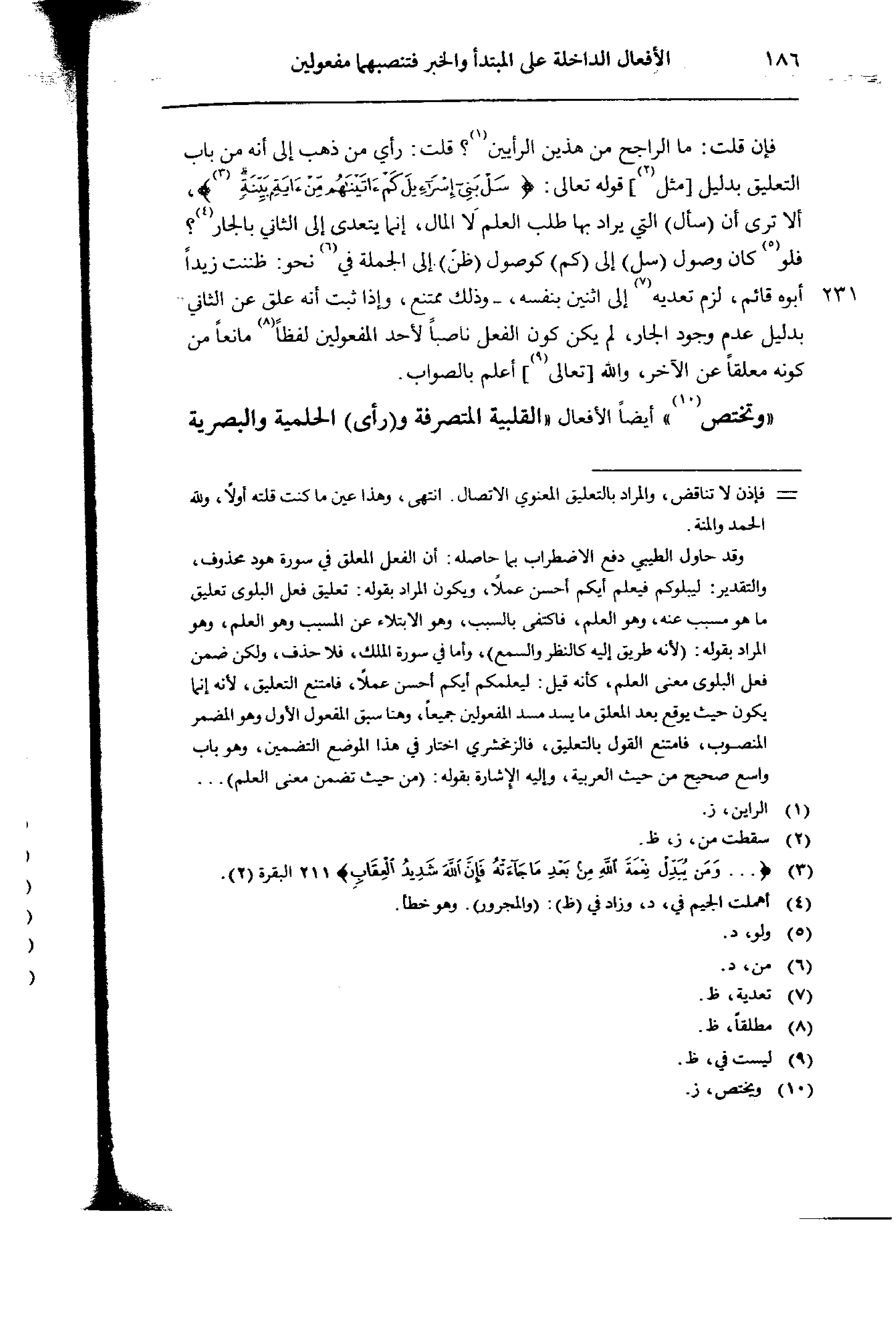 فإن قلت: ما الراجح من هذين الرأيين؟ قلت: رأي من ذهب إلى أنه من باب التعليق بدليل [مثل] قوله تعالى: {سل بني إسرائيل كم اتينهم من آية بينةٍ}، ألا ترى أن (سأل التي يراد بها طلب العلم لا المال، إنما يتعدى إلى الثاني بالجار؟ فلو كان وصول (رسل) إلى (كم) كوصول (ظن) إلى الجملة في نحو: ظننت زيدًا 231 أبوه قائم، لزم تعديه إلى اثنين بنفسه، - وذلك ممتنع، إذا ثبت أنه علق عن الثاني بدليل عدم وجود الجار، لم يكن كون الفعل ناصبًا لأحد المفعولين لفظًا مانعًا من كونه معلقًا عن الأخر، والله [تعالى] أعلم بالصواب.