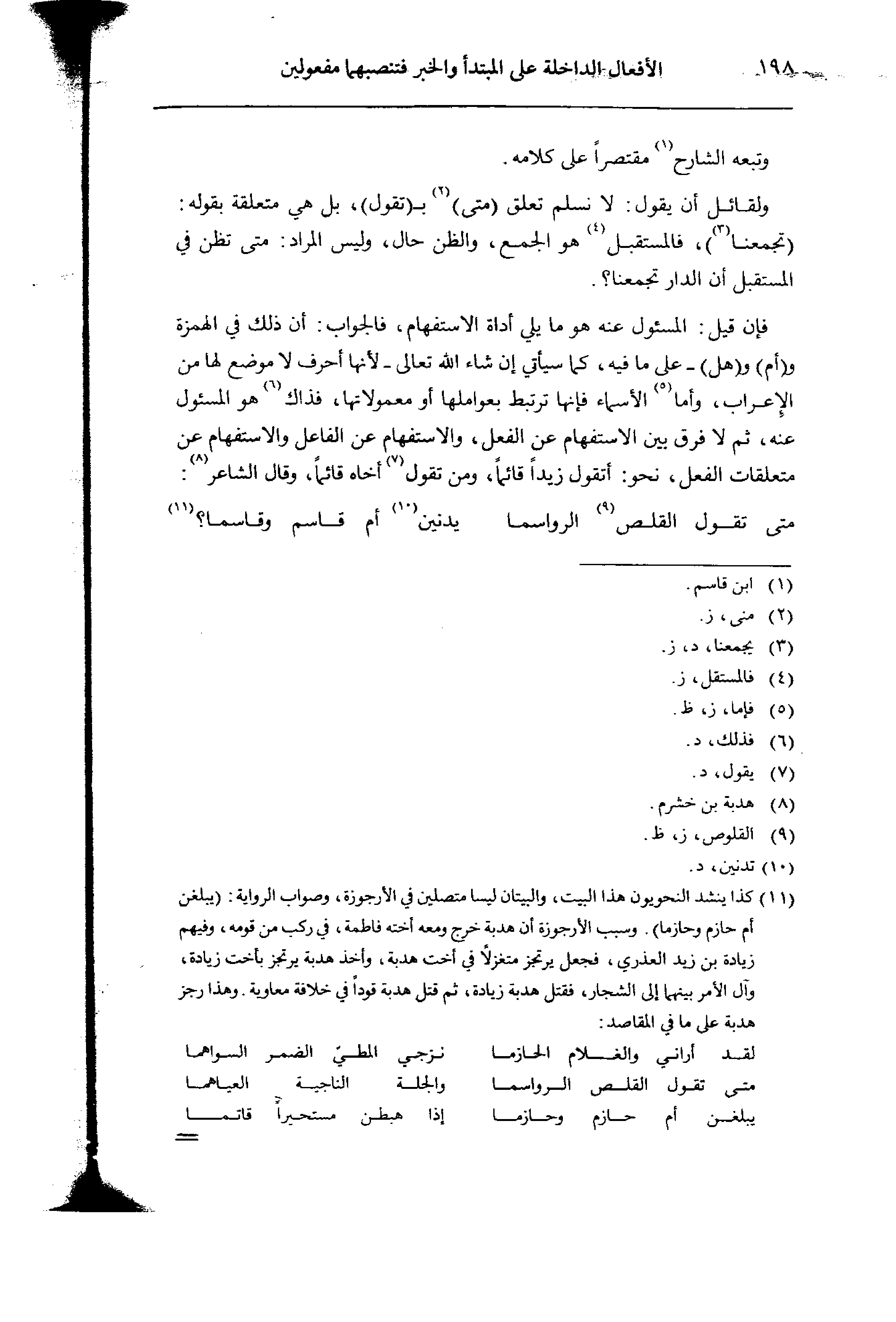 فإن قيل: المسئول عنه هو ما يلي أداة الاستفهام، فالجواب: أن ذلك في الهمزة و (أم) و (هل) - على ما فيه، كما سيأتي إن شاء الله تعالى- لأنها أحرف لا موضع لها من الإعراب، وأما السماء فإنها ترتبط بعواملها أو معمولاتها، فذاك هو المسئول عنه، ثم لا فرق بين الاستفهام عن الفعل، والاستفهام عن الفاعل والاستفهام عن متعلقات الفعل، نحو أتقول زيدًا قائمًا، ومن تقول أخاه قائمًا، وقال الشاعر: