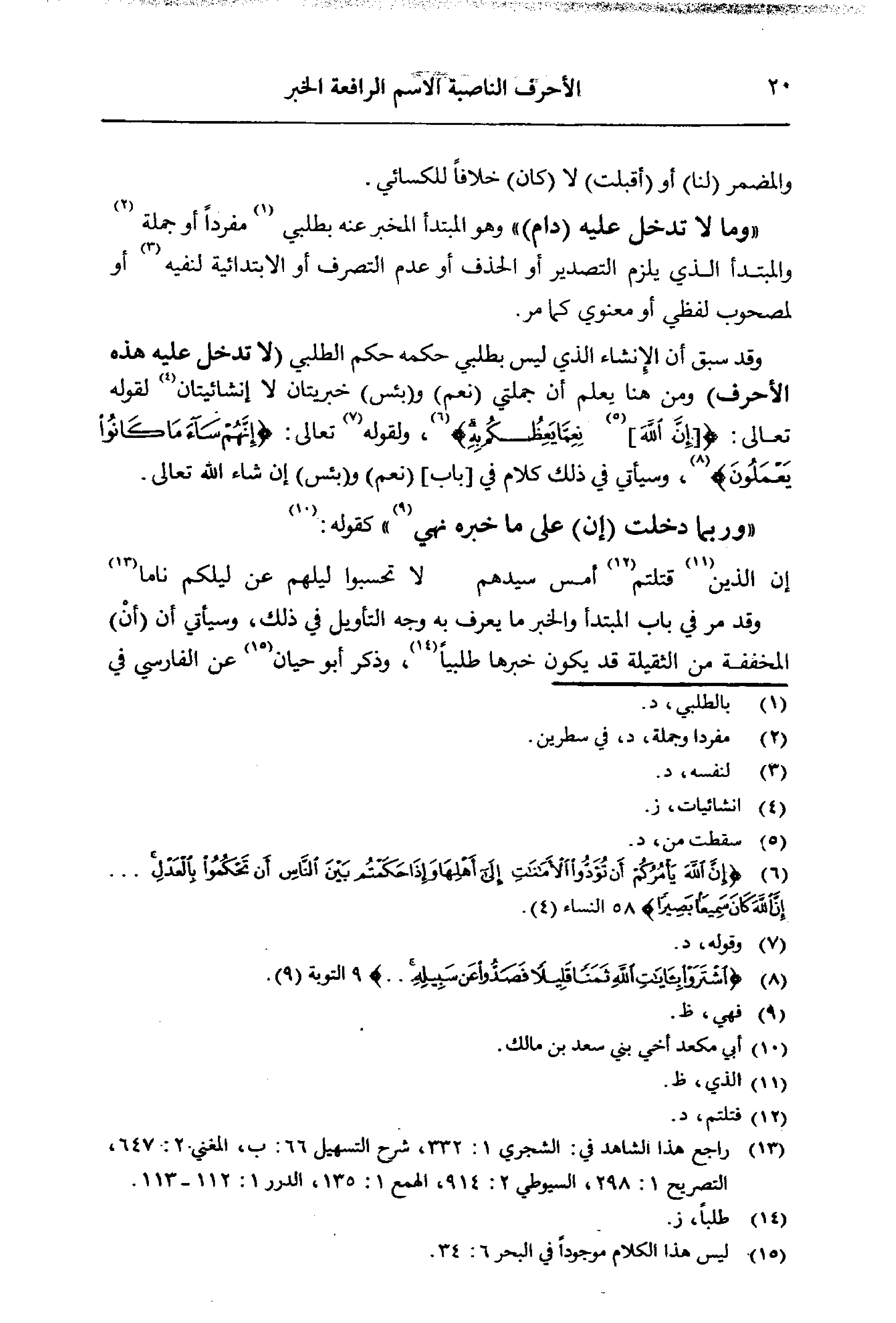 إن الذين قتلتم أمس سيدهم لا تحسبوا ليلهم عن ليلكم ناما وقد مر في باب المبتدأ والخبر ما يعرف به وجه التأويل في ذلك، وسيأتي أن (أن) المخففة من الثقيلة قد يكون خبرها طلبيا، وذكر أبو حيان عن الفارسي في