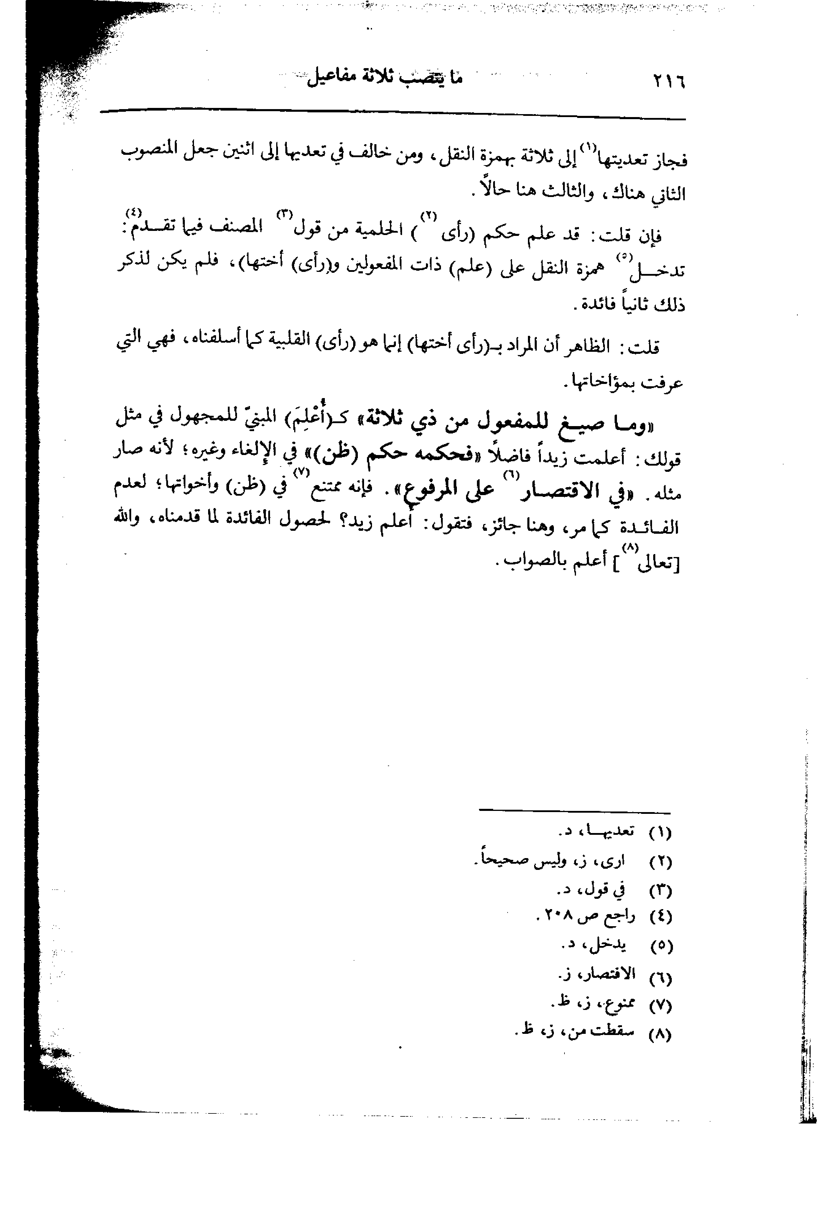 «وما صيغ للمفعوا من ذي ثلاثة» كـ (أُعْلِمَ) المبنيِّ للمجهول في مثل قولك: أعلمت زيداً فاضلاً «فحكمه حكم (ظن») في الإلغاء وغيره؛ لأنه صار مثله.