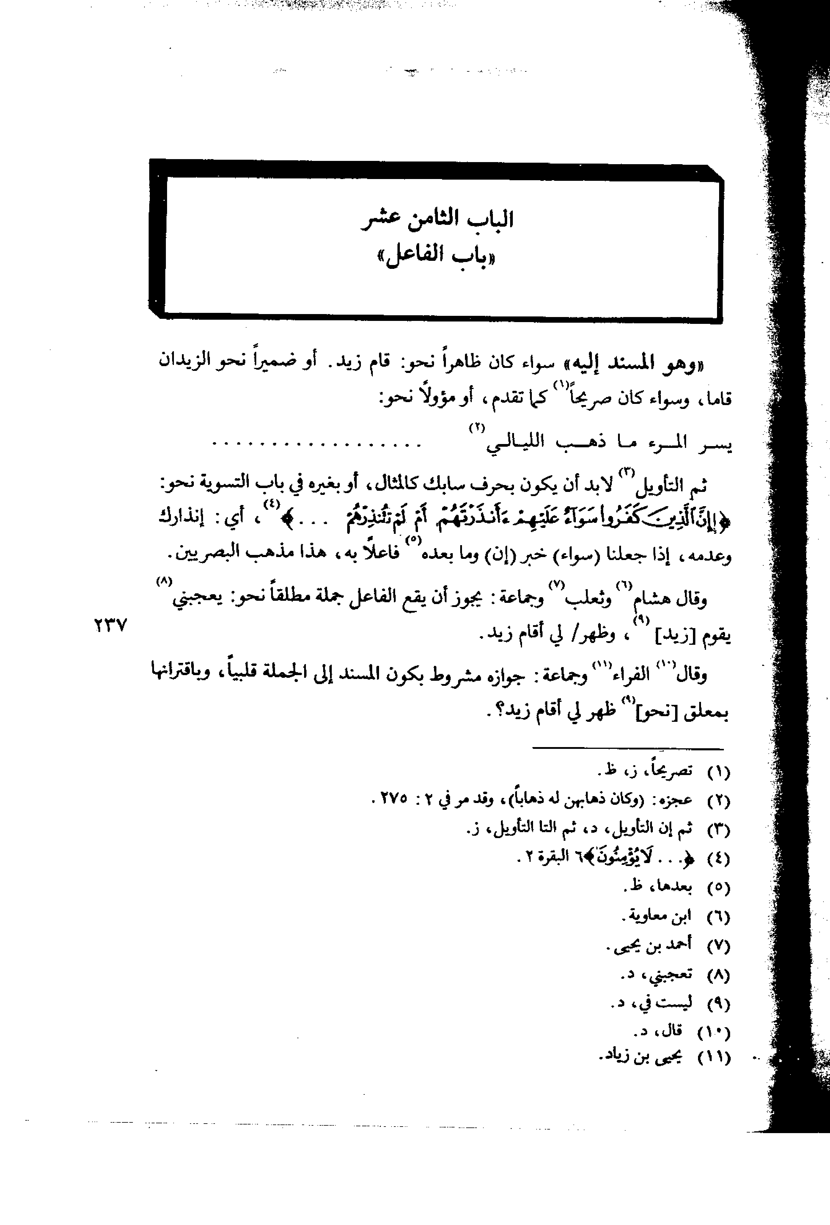 ثم التأويل لابد أن يكون بحرف سابك كالمثال، أو بغيره في باب التسوية نحو: {إن الذين كفروا سواء عليهم أنذرتهم أم لم تنذرهم ... }، أي: إنذارك وعدمه، إذ جعلنا (سواء) خبر (إن) وما بعده فاعلاً به، هذا مذهب البصريين.