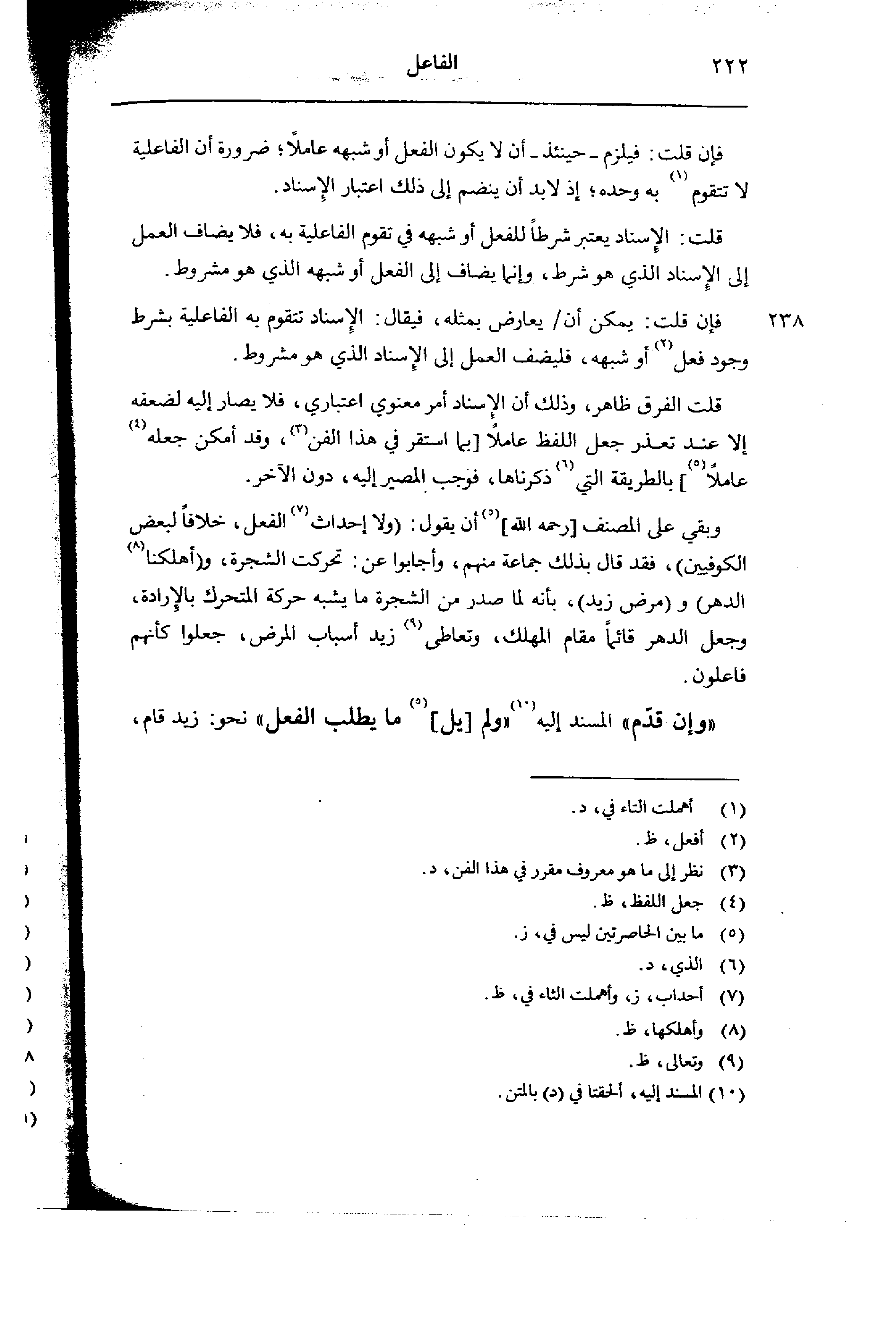 وبقى على المصنف [رحمه الله] أن يقول: (ولا إحداث الفعل، خلافاً لبعض الكوفيين)، فقد قال بذلك جماعة منهم، وأجابوا عن: تحركت الشجرة، و (أهلكنا الدهر) و (مرض زيد)، بأنه لما صدر من الشجرة ما يشبه حركة المتحرك بالإرادة، وجعل الدهر قائماً مقام المهلك، وتعاطي زيد أسباب المرض، جعلوا كأنهم فاعلون.