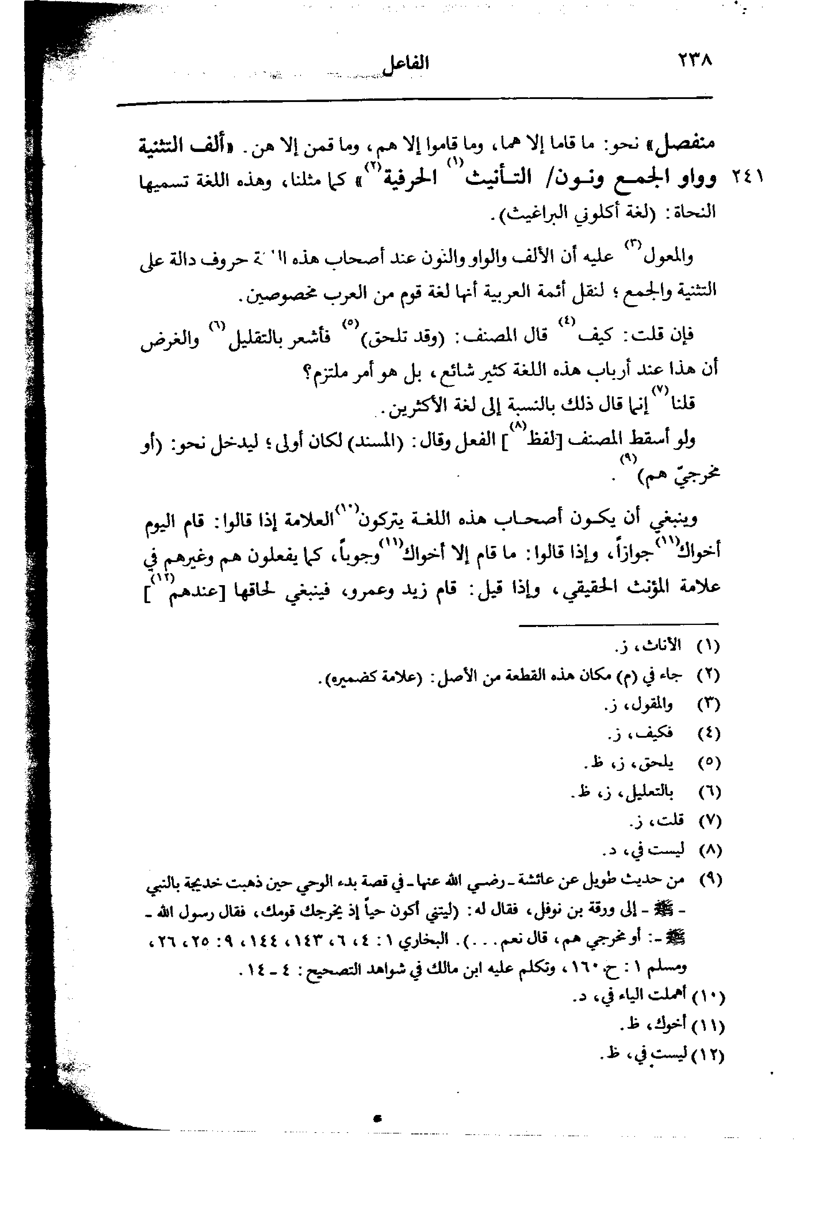 وينبغي أن يكون أصحاب هذه اللغة يتركون العلامة إذ قالوا: قام اليوم أخواك جوازاً، وإذا قالوا: ماقام إلا أخواك وجوباً، كما يفعلون هم وغيرهم في علامة المؤنث الحقيقي، وإذا قيل: قام زيد وعمرو، فينبغي لحاقها [عندهم]