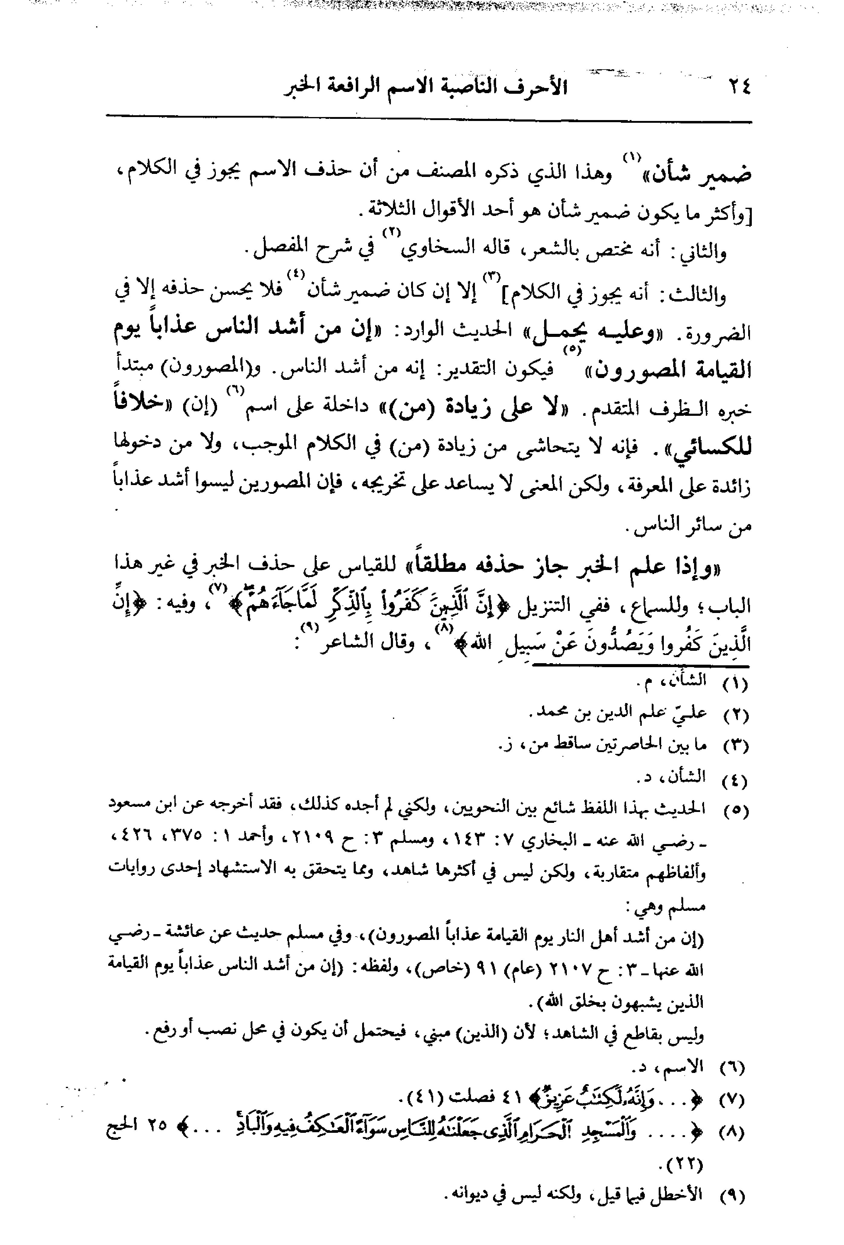 والثالث: أنه يجوز في الكلام] إلاإن كان ضمير شأن فلا يحسن حذفه إلا في الضرورة. «وعليه يحمل» الحديث الوارد: «إن من أشد الناس عذابا يوم القيامة المصورون» فيكون التقدير: إنه من أشد الناس. و (المصورون) مبتدأ خبره الظرف المتقدم. «لا على زيادة (من)» داخلة على اسم (إن) «خلافا للكسائي». فإنه لا يتحاشى من زيادة (من) في الكلام الموجب، ولا من دخولها زائدة على المعرفة، ولكن المعنى لا يساعد على تخريجه، فإن المصورين ليسوا أشد عذابا من سائر الناس.