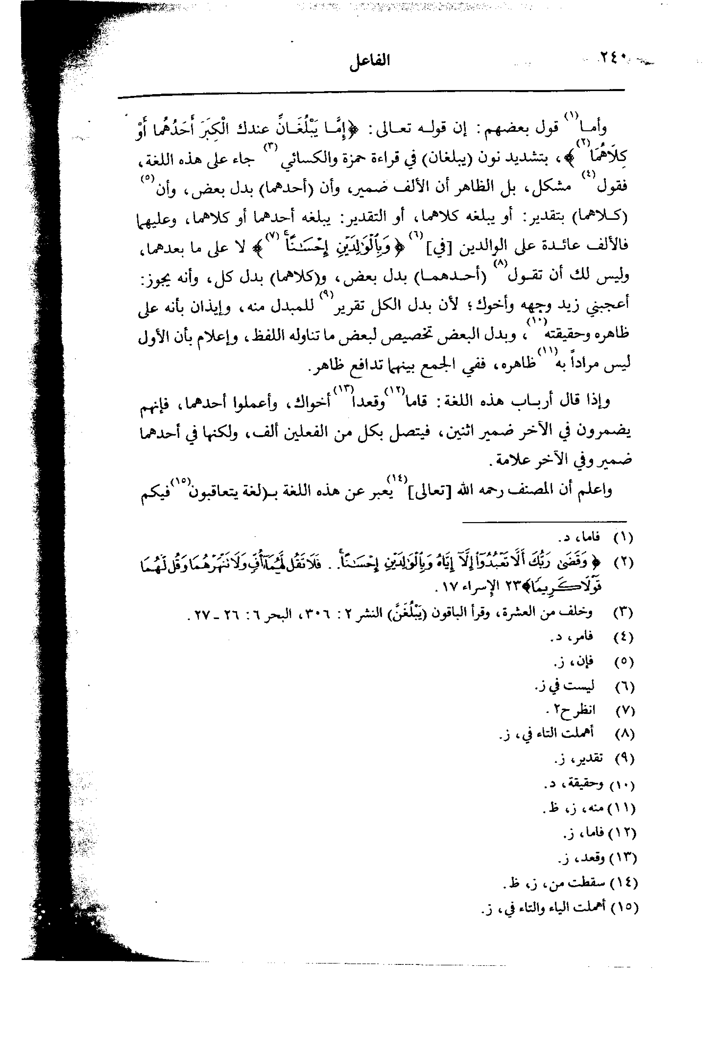 وأما قول بعضهم: إن قوله تعالى: {إما يبلغان عندك الكبر أحدهما أو كلاهما}، بتشديد نون (يبلغان) ي قراءة حمزة والكسائي جاء على هذه اللغة فقول مشكل، بل الظاهر أن الألف ضمير، وأن (أحدهما) بدل بعض، وأن (كلاهما) بتقدير: أو يبلغه كلاهما، أو التقدير: يبلغه أحدهما أو كلاهما، وعليهما فالألف عائدة على الوالدين [في] {وبالولدين إحسنا} لا على ما بعدهما، وليس لك أن تقول (أحدهما) بدل بعض، و (كلاهما) بدل كل، وأنه يجوز: أعجبني زيد وجهه وأخوك؛ لأن بدل الكل تقرير للمبدل منه، وإيذان بأنه على ظاهره وحقيقته، وبدل البعض تخصيص لبعض ما تناوله اللفظ، وإعلام بأن الأول ليس مراداً به ظاهره، ففي الجمع بينهما تدافع ظاهر.