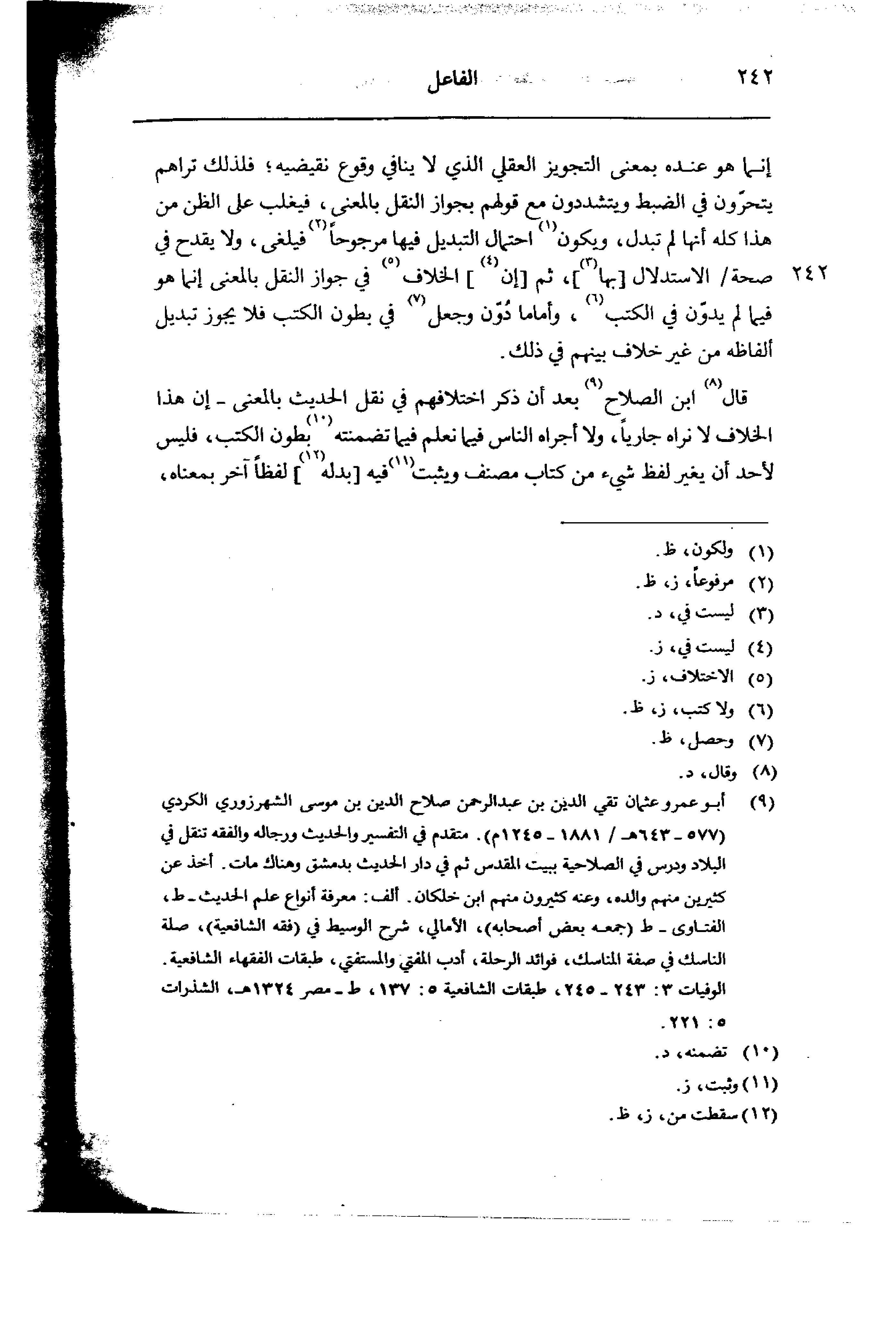 قال ابن الصلاح بعد أن ذكر اختلافهم في نقل الحديث بالمعنى- إن هذا الخلاف لا نراه جارياً، ولا أجراه الناس فيما نعلم فيما تضمنته بطون الكتب، فليس لأحد أن يغير لفظ شيء من كتاب مصنف ويثبت فيه [بدله] لفظاً آخر بمعناه،