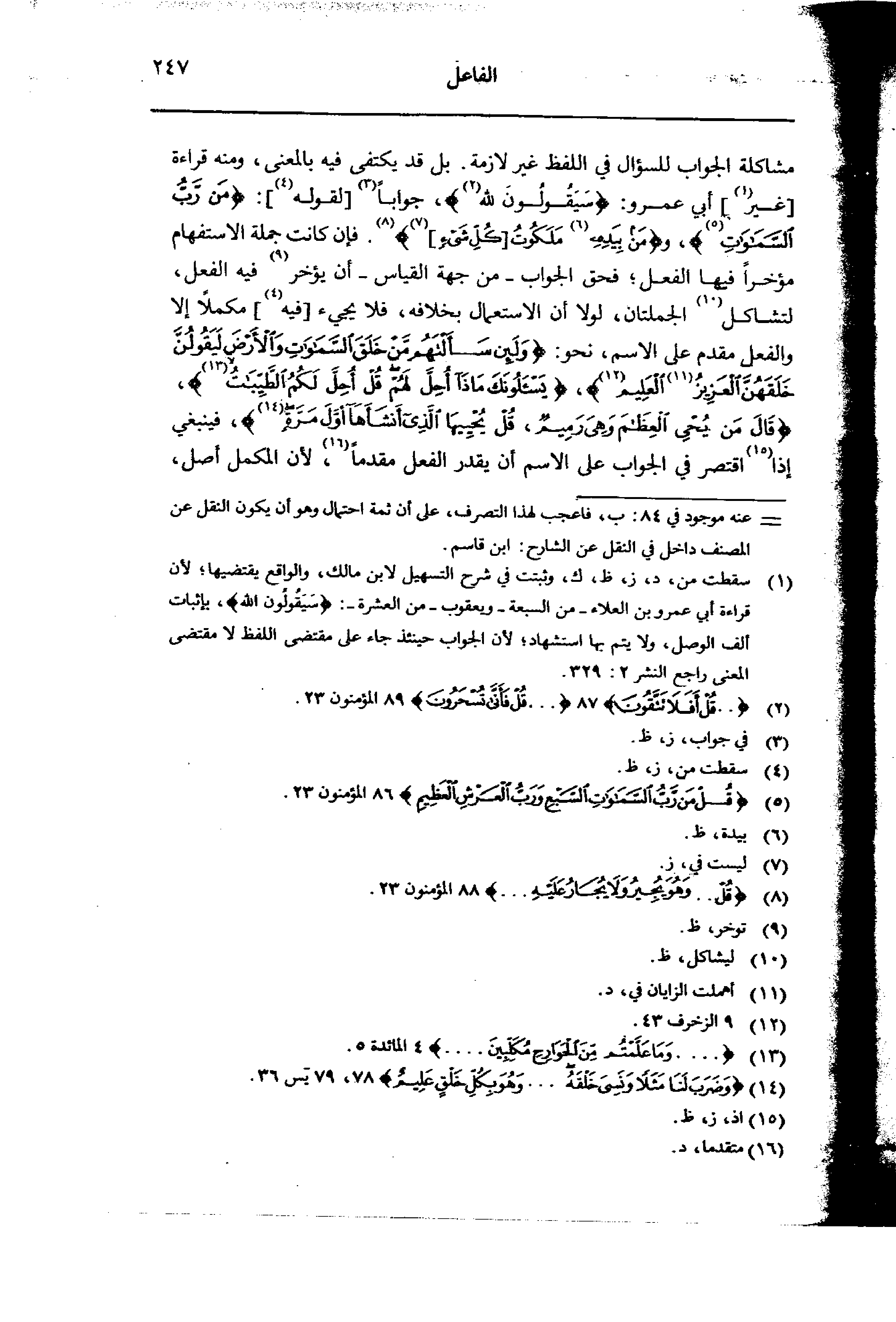 مشاكلة الجواب للسؤال في اللفظ غير لازمة. بل قد يكتفي فيه بالمعنى، ومنه قراءة [غير] أبي عمرو: {سيقولون لله}، جوابا [لقوله]: {من رب السموات}، و {من بيده ملكوت [كل شيء]}. فإن كانت جملة الاستفهام مؤخراً فيها الفعل؛ فحق الجواب- من جهة القياس- أن يؤخر فيه الفعل، لتشاكل الجملتان، لولا أن الاستعمال بخلافه، فلا يجيء [فيه] مكملا إلا والفعل مقدم على الاسم، نحو: {ولئن سألتهم من خلق السموات والأرض ليقولن خلقهن العزيز العليم}، {يسئلونك مذا أحل لهم قل أحل لكم الطيبات}، {قال من يحيى العظم وهي رميم، قل يحيها الذي أنشأها أول مرة}، فينبغي إذا اقتصر في الجواب على الاسم أن يقدر الفعل مقدما، لأن المكمل أصل،