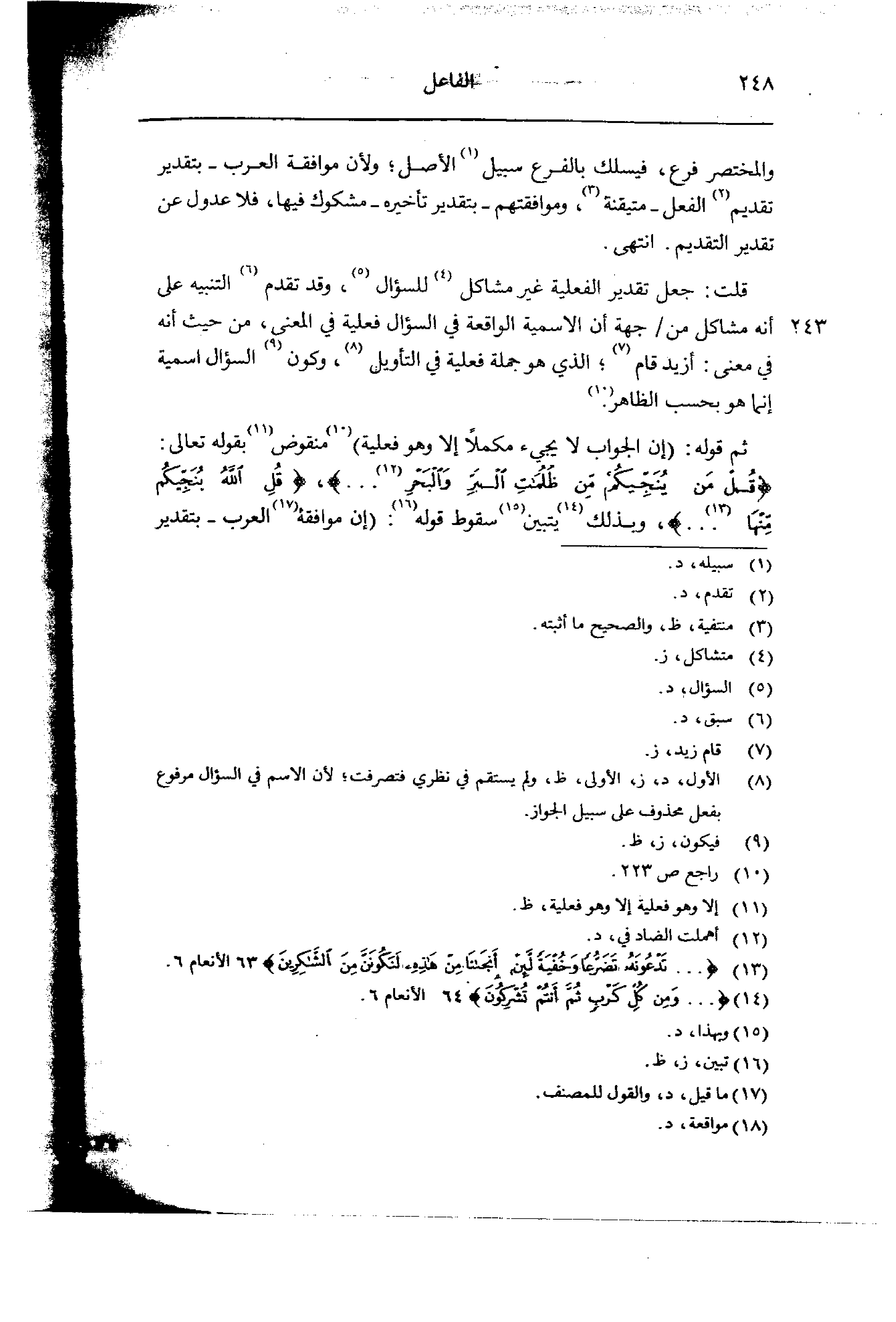 والمختصر فرع، فيسلك بالفرع سبيل الأصل؛ ولأن موافقة العرب- بتقدير تقديم الفعل- متيقنة، وموافقتهم- بتقدير تأخيره- مشكوك فيها، فلا عدول عن تقدير التقديم. انتهى.