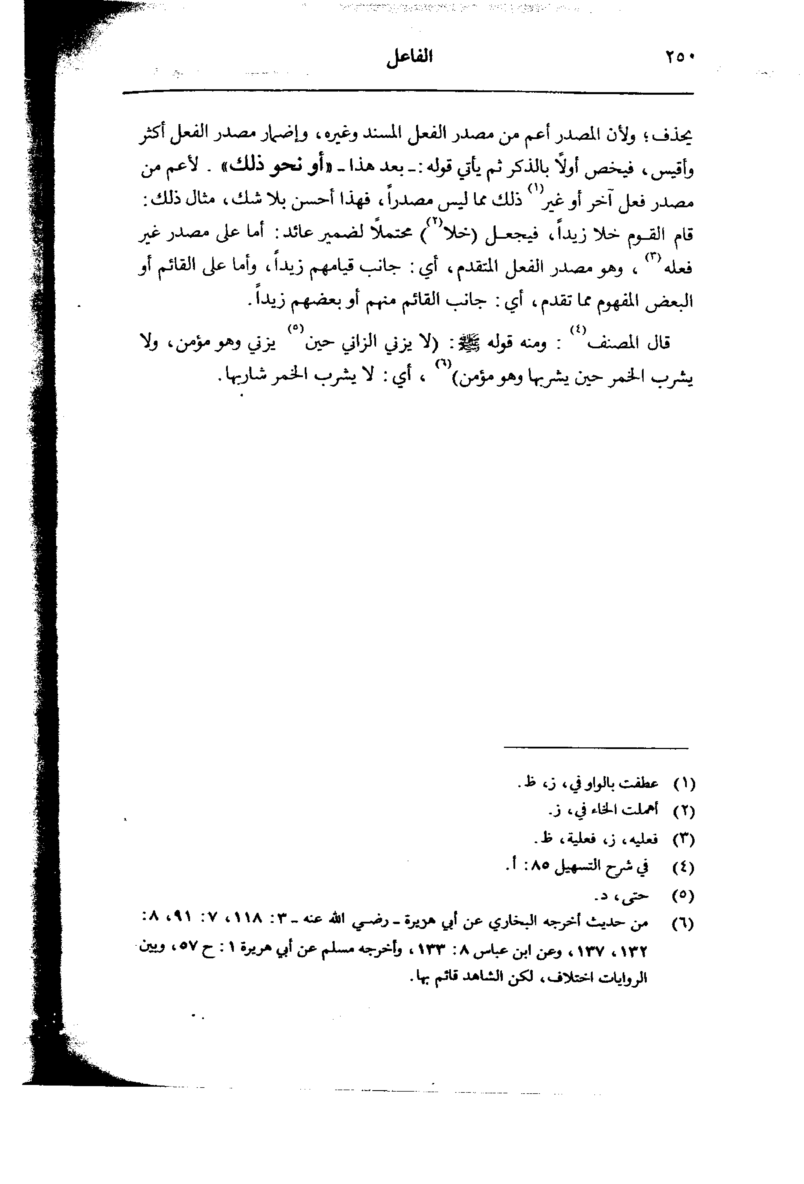 قال المصنف: ومنه قوله صلى الله عليه وسلم: (لا يزني الزاني حين يزني وهو مؤمن، ولا يشرب الخمر حين يشربها وهو مؤمن)، أي: لا يشرب الخمر شاربها.