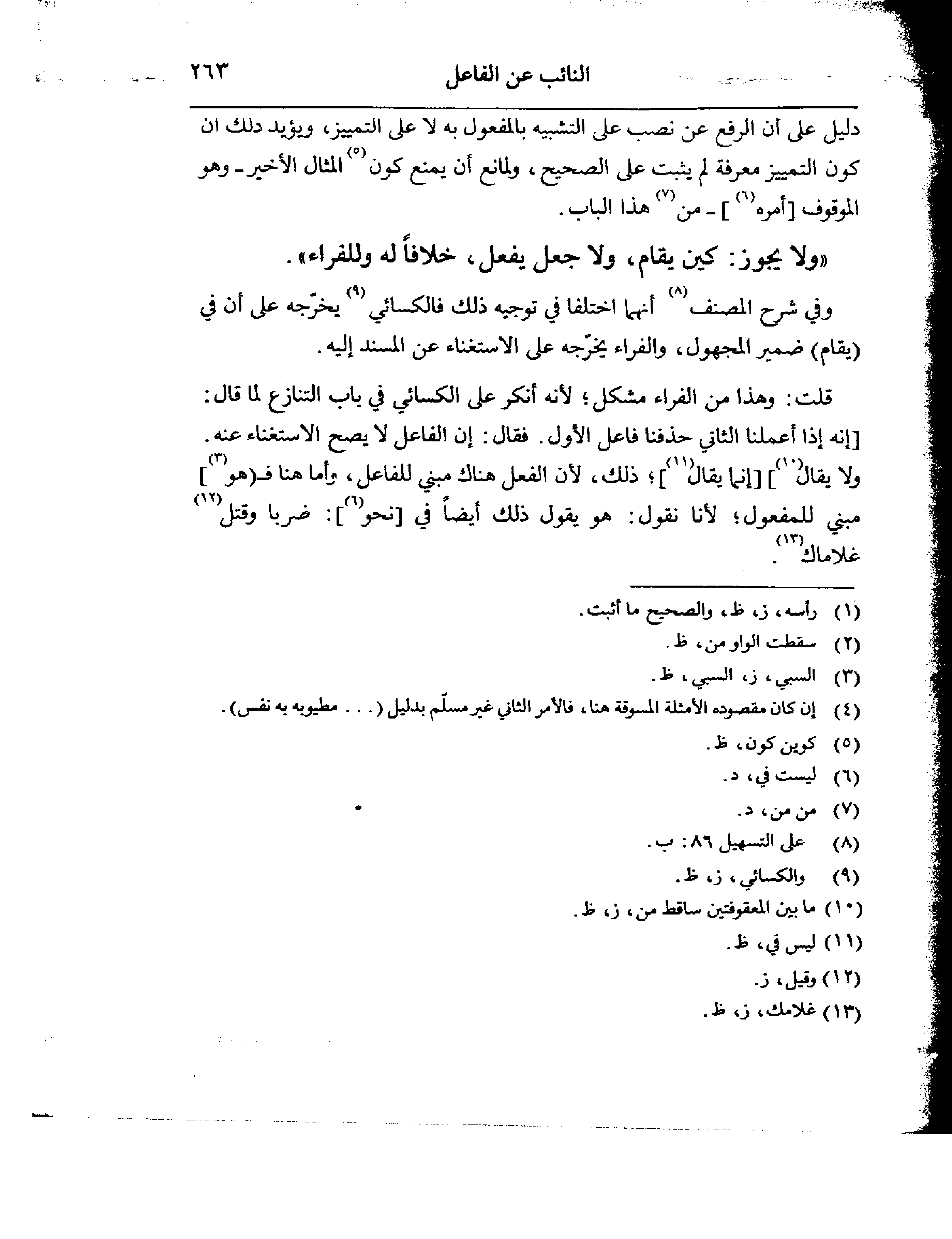 قلت: وهذا من الفراء مشكل؛ لأنه أنكر عل الكسائي في باب التنازع لما قال: [إنه إذا أعملنا الثاني حذفنا فاعل الأول. فقال: إن الفاعل لا يصح الاستغناء عنه. ولايقال] [إنما يقال]؛ ذلك، لأن الفعل هناك مبنى للفاعل، وأما هنا فـ (هو] مبني للمفعول؛ لأنا نقول: هو يقول ذلك أيضاً في [نحو] ضربا وقتل غلاماك.