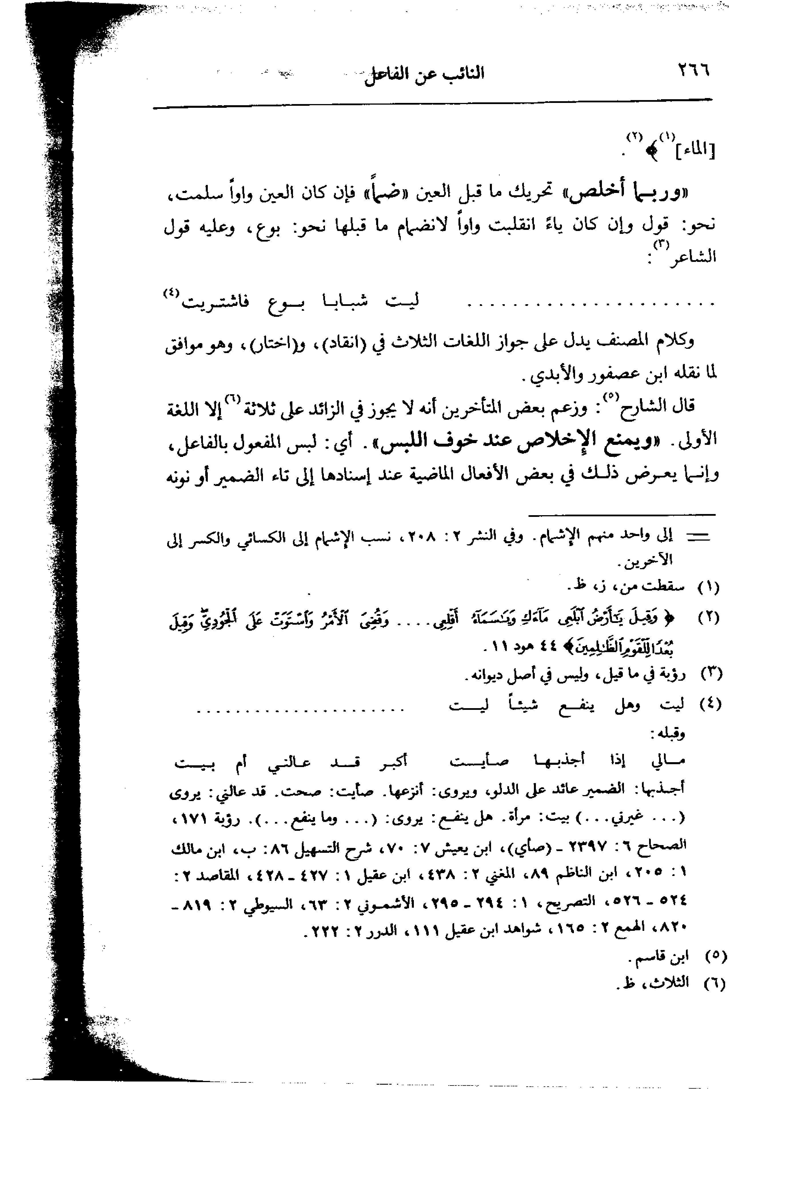 قال الشارح: وزعم بعض المتأخرين أنه لايجوز في الزائد على ثلاثة إلا اللغة الأولى. «ويمنع الإخلاص عند خوف اللبس». أي: لبس المفعول بالفاعل، وإنما يعرض ذلك في بعض الأفعال الماضية عند إسنادها إلى تاء الضمير أو نونه