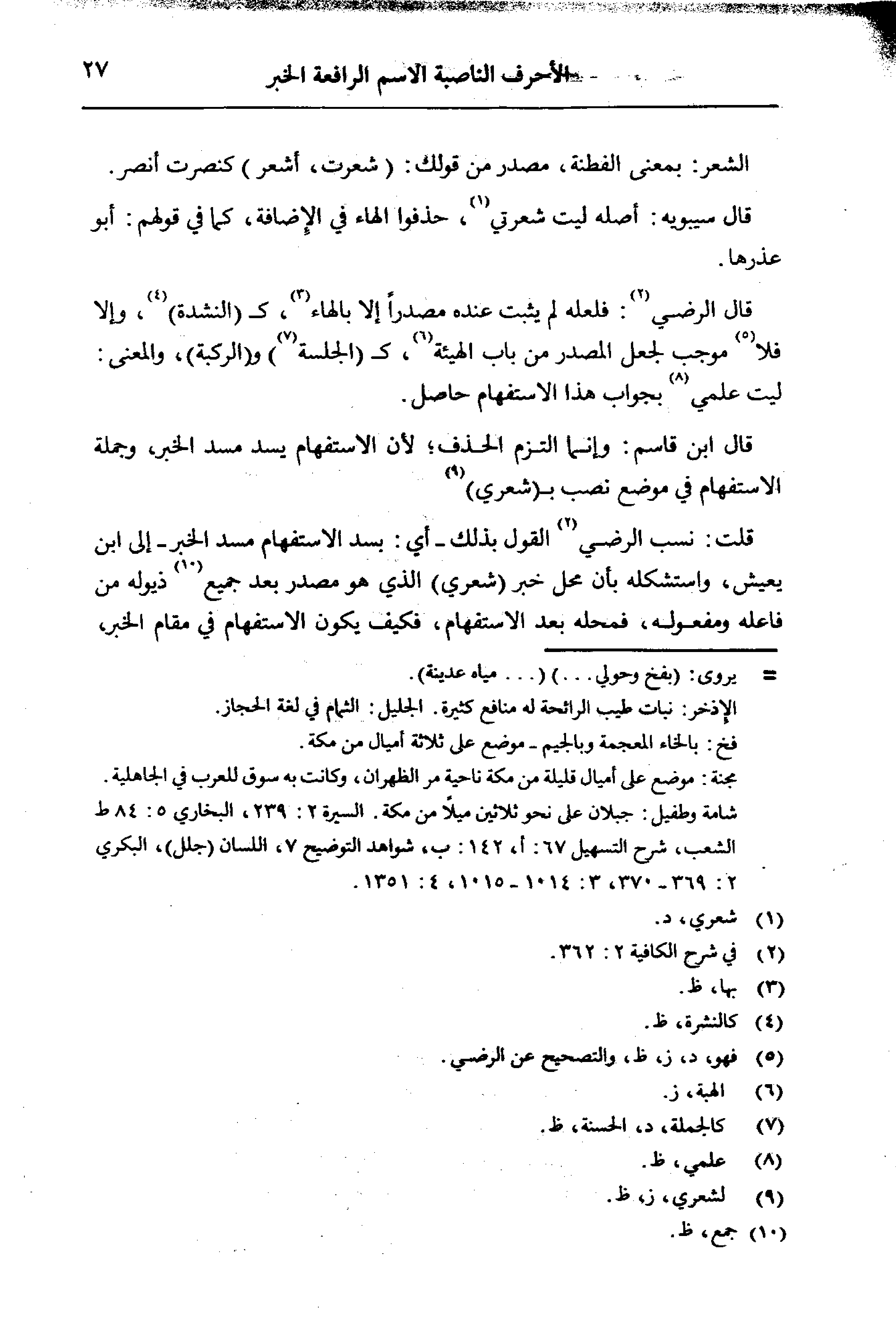 قال الرضي: فلعله لم يثبت عنده مصدرا إلا بالهاء، كـ (النشدة)، وإلا فلا موجب لجعل المصدر من باب الهيئة، كـ (الجلسة) و (الركبة)، والمعنى: ليت علمي بجواب هذا الاستفهام حاصل.