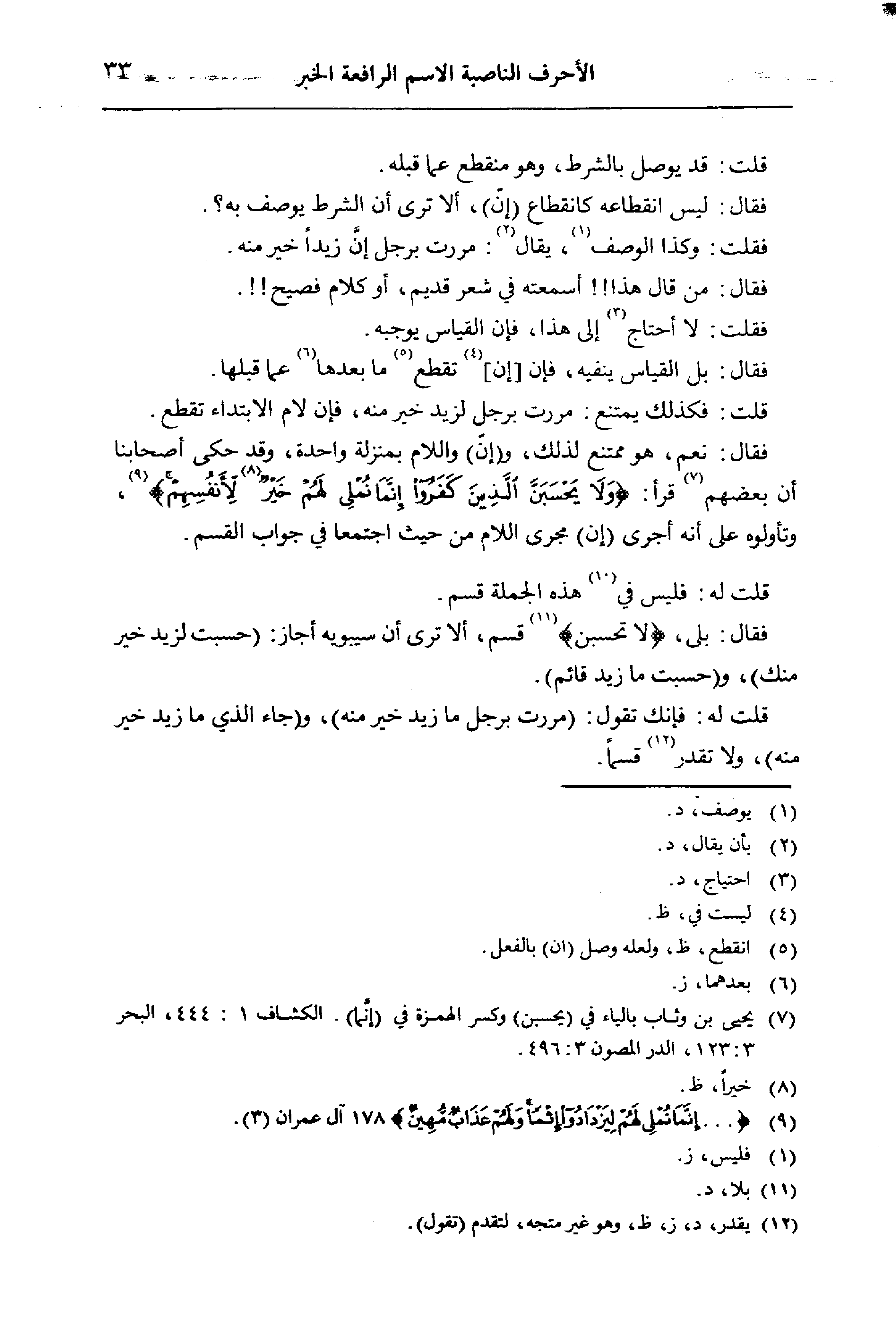 فقال: بلى، {لا تحسبن} قسم، ألا ترى أن سيبويه أجاز: (حسبت لزيد خير منك)، و (حسبت ما زيد قائم).