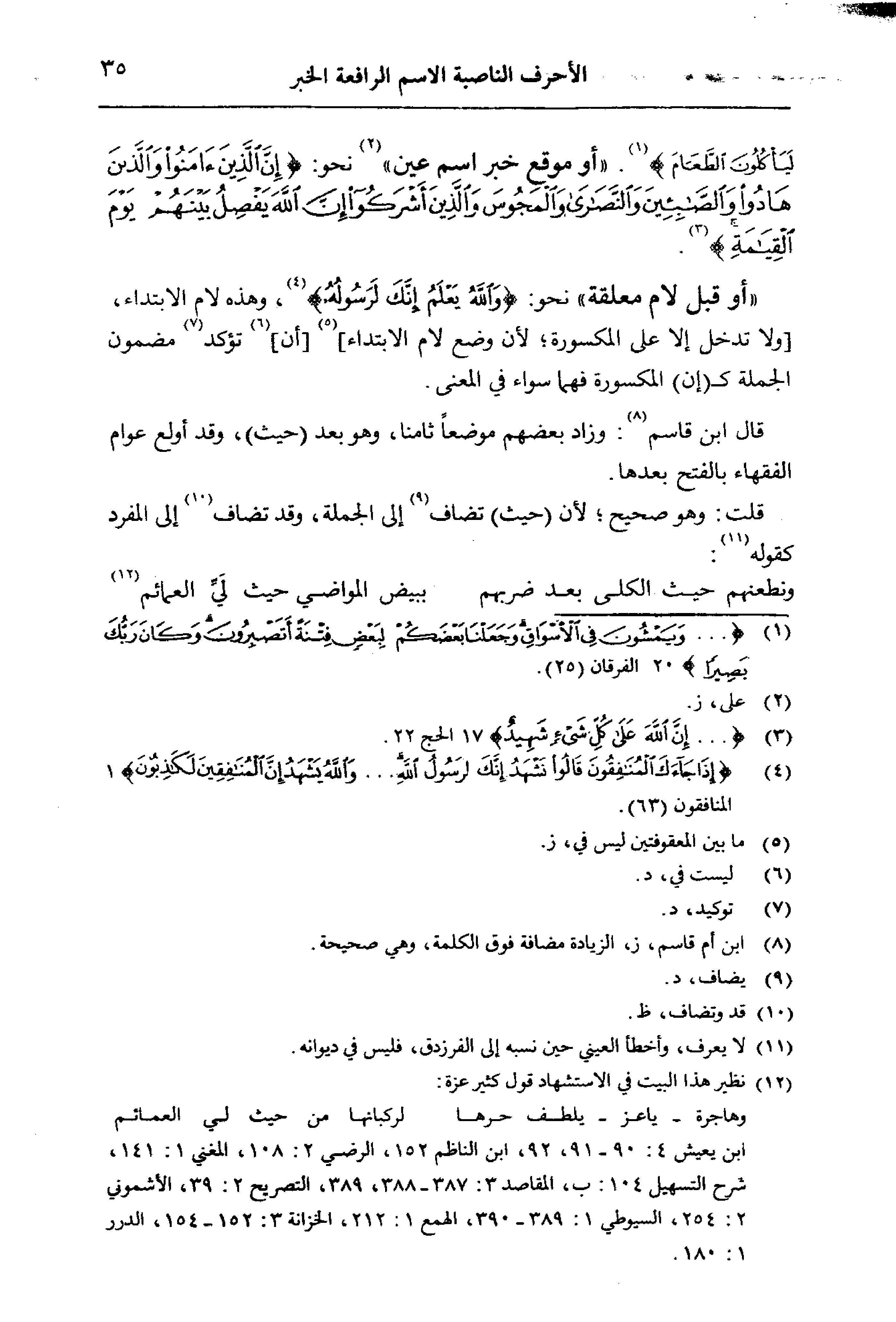 «أو قبل لام معلقة» نحو: {وَاللَّهُ يَعْلَمُ إِنَّكَ لَرَسُولُهُ}، وهذه لام الابتداء، [ولا تدخل إلا على المكسورة؛ لأن وضع لام الابتداء] [أن] تؤكد مضمون الجملة كـ (إن) المكسورة فهما سواء في المعنى. قال ابن قاسم: وزاد بعضهم موضعا ثامنا، وهو بعد (حيث)، وقد أولع عوام الفقهاء بالفتح بعدها.