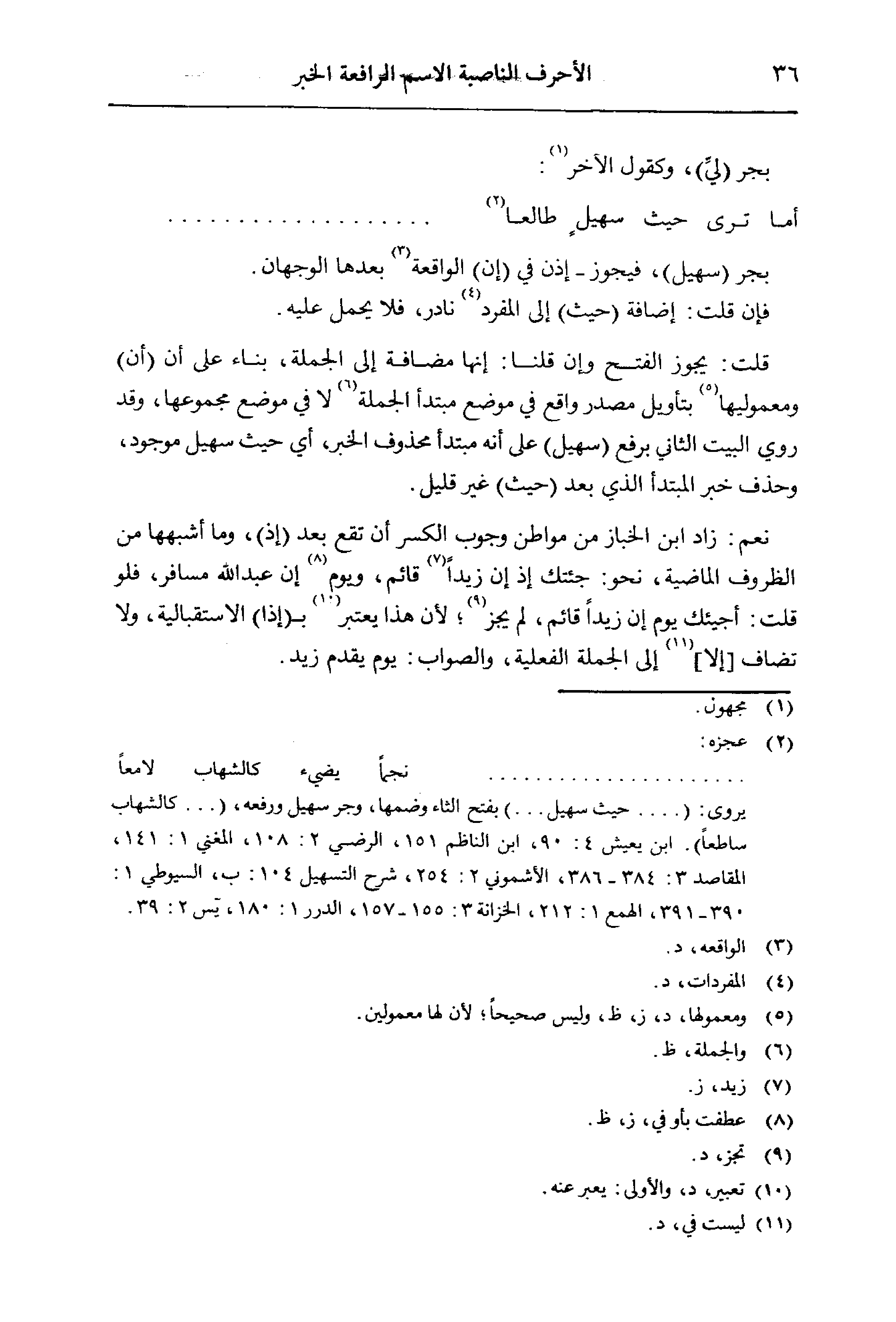 قلت: يجوز الفتح وإن قلنا: إنها مضافة إلى الجملة، بناء على أن (أن) ومعموليها بتأويل مصدر واقع في موضع مبتدأ الجملة لا في موضع مجموعها، وقد روي البيت الثاني برفع (سهيل) على أنه مبتدأ محذوف الخبر، أي حيث سهيل موجود، وحذف خبر المبتدأ الذي بعد (حيث) غير قليل.